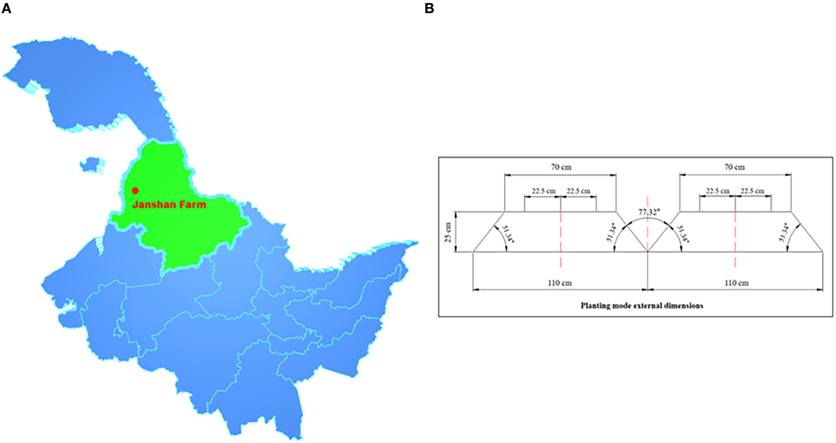 Figure 2. Experimental locations and planting patterns. (A) Location of Jianshan Farm, Heihe City, Heilongjiang Province, China. (B) Three-row planting pattern on soybean ridges.