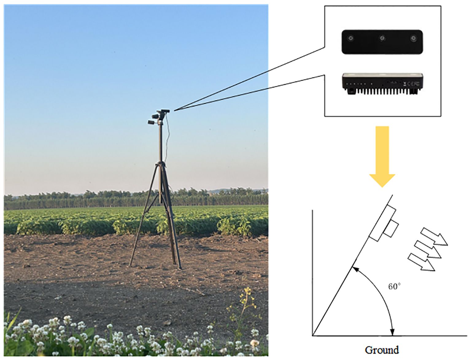 The image acquisition equipment included two OAK-D-S2 vision sensors with three lenses: an RGB camera (monocular color camera) and a binocular camera (stereo vision system consisting of two black-and-white cameras). The OAK-D-S2 was mounted on a camera support 2 m above the ground at an angle of 60.000° to the ground. One image sensor was oriented in the forward direction of the wheeled agricultural machine for headland positioning, while the other was oriented perpendicular to the forward direction, toward the soybean crop, for estimation of the azimuth angle of crop rows in the ridge relative to the camera. The placement and shooting angle of the image sensors are shown in Figure 3.