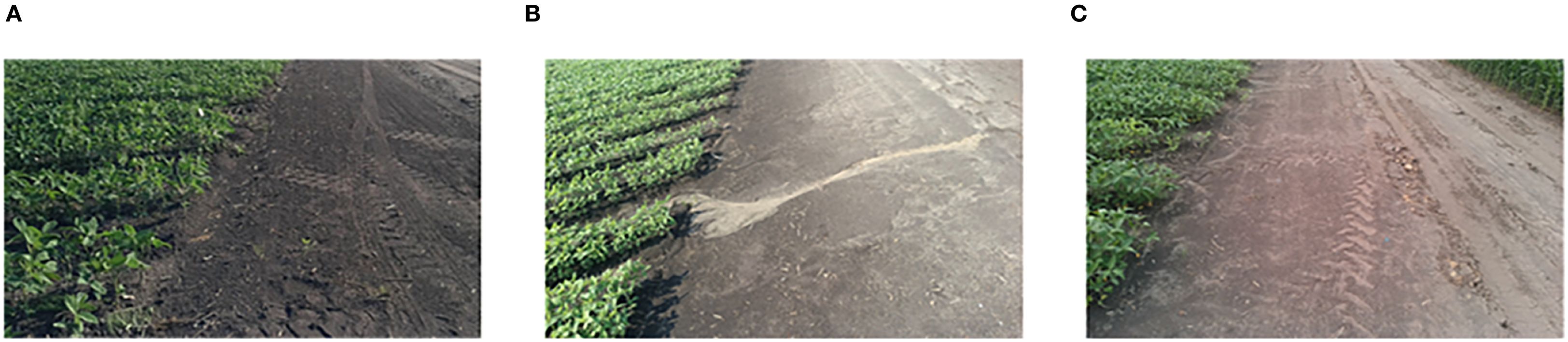 In this study, soybean during the V3–V8 growth stages was used as the research object. The location was Jianshan Farm Science and Technology Park, Heihe City, Heilongjiang Province, China (48°52′17.16″N, 125°25′9.40″E), as shown in Figure 2A. The soybean planting pattern in this area was three rows on a ridge, with a bottom width of 1.100 m, a platform width of 0.700 m, a height of 0.250 m, a 77.32° angle between the two ridges, and a 51.34° angle of inclination of the platform. Three rows of soybeans were planted on the centerline of the ridge platform, offset to the left and right by 0.225 m, respectively, as shown in Figure 2B.