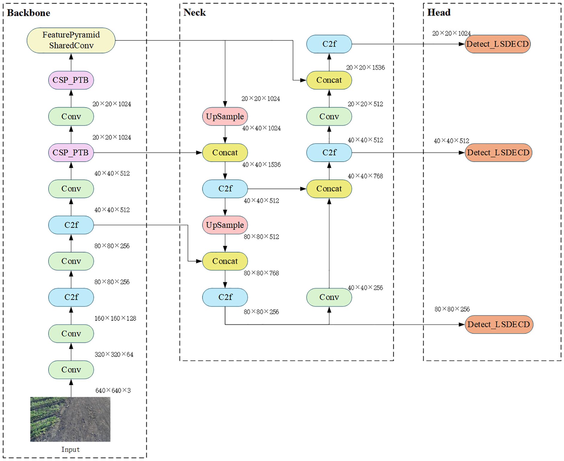 An improved target detection algorithm, YOLO-PFL, was proposed in this study, and its network structure is shown in Figure 5. The model was based on YOLOv8, and its structure introduced a partial Transformer modeling mechanism and a fine-grained feature fusion strategy while maintaining the advantages of the original YOLO framework, in order to improve target detection capability in multi-scale and complex scenes. Its main improvements were reflected in three aspects: the introduction of the CSP-PTB (Cross Stage Partial-Partially Transformer Block) module to replace the partially convolutional structure in the backbone network in order to enhance the global modelling capability; the inclusion of the FeaturePyramidSharedConv module in the feature fusion stage that used shared convolutional kernels to achieve multi-scale context awareness; and introducing LSDECD (Lightweight Shared Detail Enhanced Convolutional Detection Head) (Sun et al., 2025), a lightweight detail enhancement module, in the detection head part to enhance the detection accuracy and efficiency.