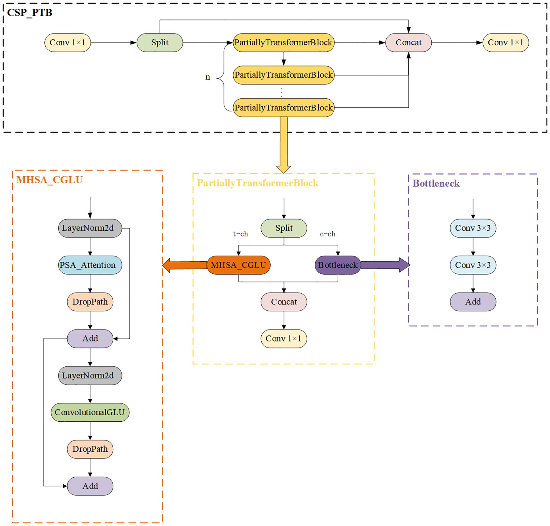 1) To enhance feature extraction capabilities while effectively controlling computational costs hybrid structure called CSP-PTB (Cross Stage Partial–Partially Transformer Block) was designed (Figure 6). This module divided the input feature channels into two parts, processed by CNN and Transformer, respectively. CNN extracted local features, while the Transformer obtained global features through multihead self-attention (MHSA), achieving complementarity between local and global information. To avoid greatly increasing computational complexity, only some channels were used for the Transformer block. To further improve nonlinear expression ability, the module introduced an MHSA-CGLU structure, replacing the traditional feed-forward network with a convolutional gated linear unit (CGLU). The structure also supported dynamically adjusting the proportion of channels used for the Transformer according to model size, adapting to different computational resources and task requirements.