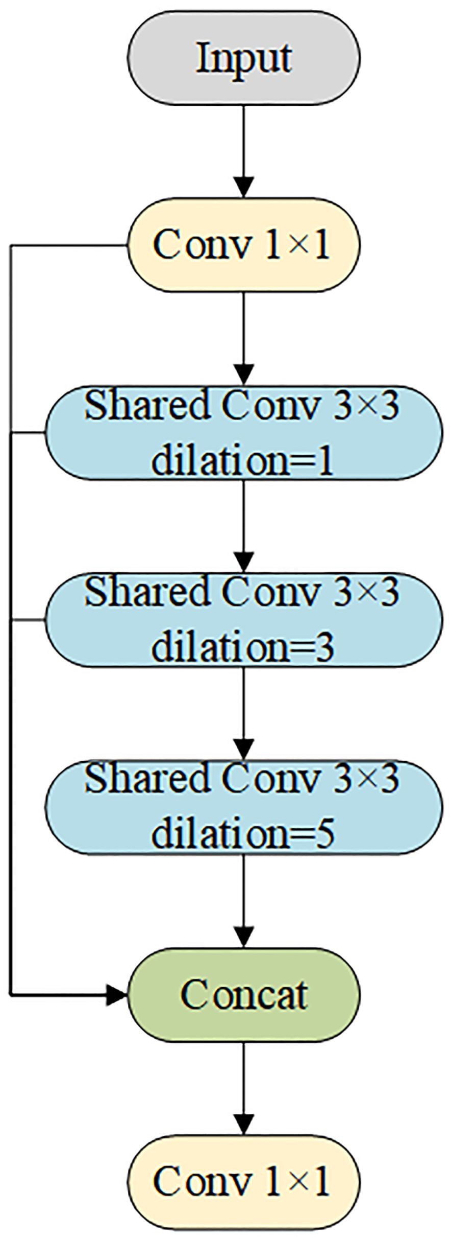 2) To improve efficiency and detection of multi-scale targets, the FeaturePyramidSharedConv module was introduced (Figure 7). Convolutional layers with different dilation rates captured both local details and global contextual information. Shared convolutional layers (self.share_conv) enabled parameter reuse across feature maps at different scales, ensuring consistent feature representation and efficient fusion. Compared with the pooling operation of SPPF, the convolution operation was more flexible and expressive, capturing fine-grained features and improving multi-scale fusion without significantly increasing model complexity. The sharing mechanism also enhanced the model’s generalization ability, making it more stable when dealing with images that had significant distribution variations or severe interference.
