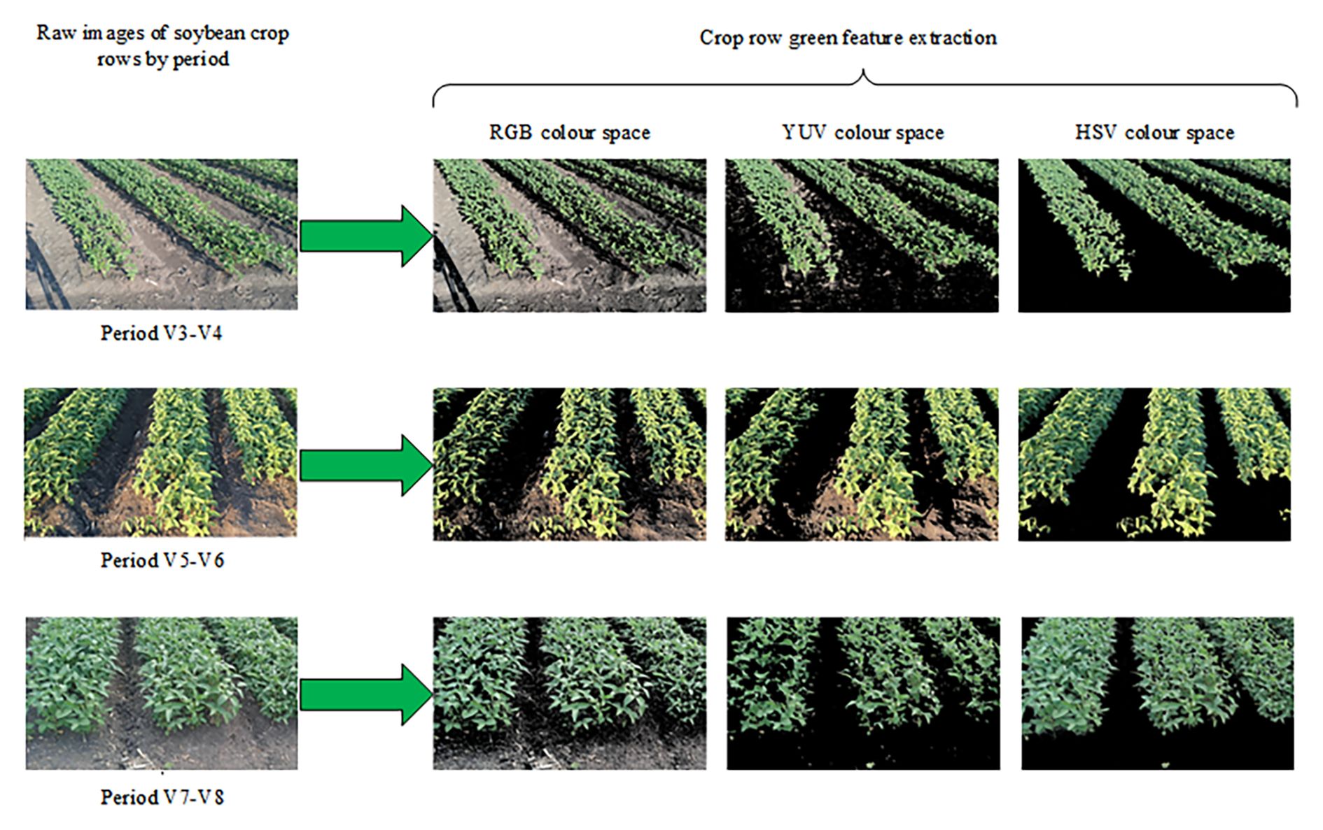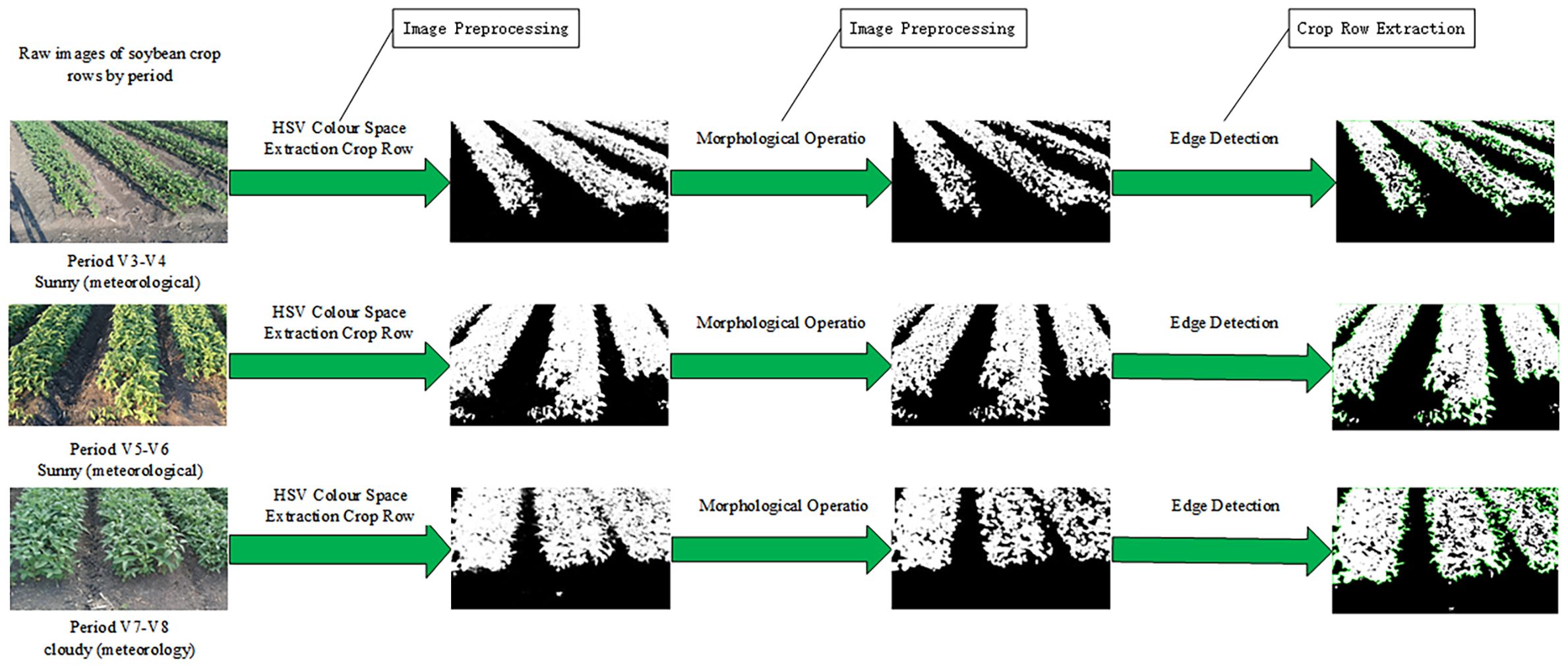 Contours were detected using the cv2.findContours() function, and a minimum area threshold was set to filter out small noisy contours. This series of preprocessing and crop row extraction methods effectively separated soybean crop rows from the cluttered field background.