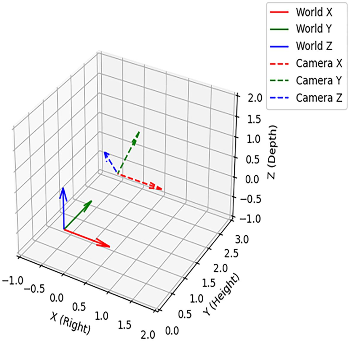 The relationship between the world coordinate system and the camera coordinate system as shown in Figure 10, the dashed line represented the camera coordinate system (PC), the solid line indicated the world coordinate system (PW), the world coordinate system World Z (ZW) was the forward direction, World Y (YW) was the height perpendicular to the ground, World X (XW) was the horizontal direction of the ground, the XW was negative in the right half of the ZW axis and positive in the left half; The camera was rotate around the XW axis by 30.000°, and the origin was set 2 m vertically above the world coordinate system at (0.000, 2.000, 0.000). The translation vector T of the origin of the PC in the PW is shown in Equation 16.