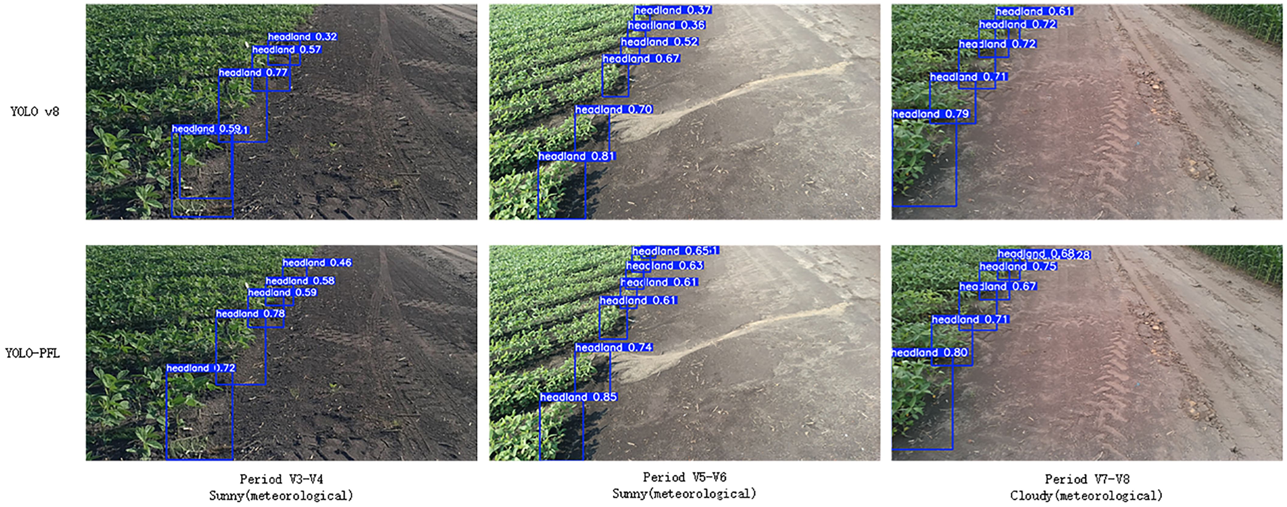 It can be seen that the improved YOLO-PFL model has more obvious advantages compared to the YOLOv8n model, which reduces the amount of computation and the number of parameters and saves storage space under the premise of guaranteeing detection accuracy and rate. Moreover, the improved YOLOv8n algorithm improves the problem of inaccurate target positioning and target feature recognition in the ridge, which is suitable for the embedded terminals of agricultural machines.
