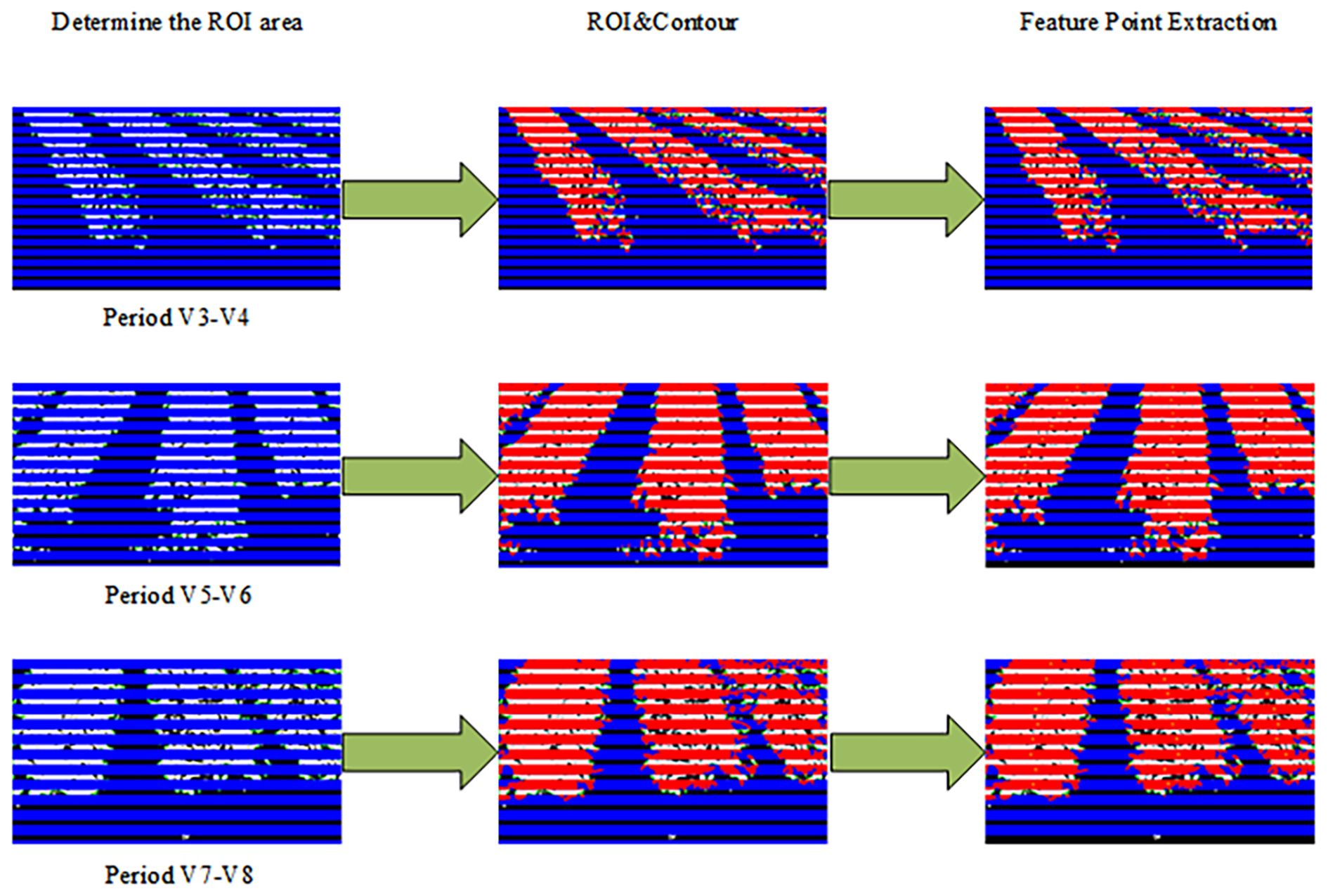 As shown in Figure 13, multiple ROIs were constructed on the image from which the crop row contours were extracted. These were divided into a series of blue-banded regions from top to bottom, effectively enhancing the local structural analysis of longitudinal crop row distribution. The intersection portions between the ROI regions and the closed contours of the crop rows were marked in red, visualizing the spatial distribution of the crop rows in each ROI. This operation “cut” a continuous crop row into multiple smaller regions with distinct boundaries, which helped capture the local morphological features of the crop row.