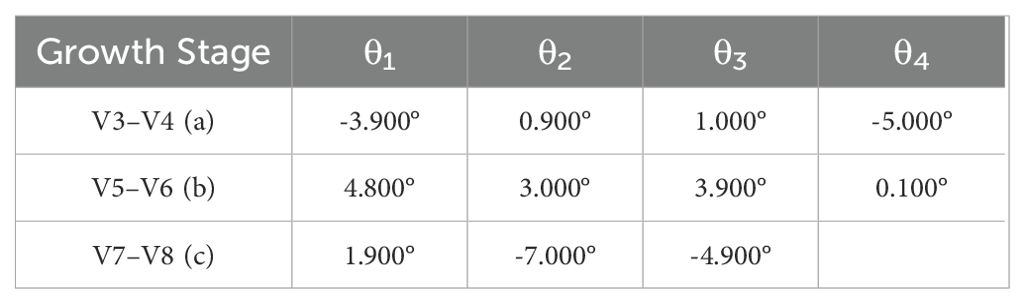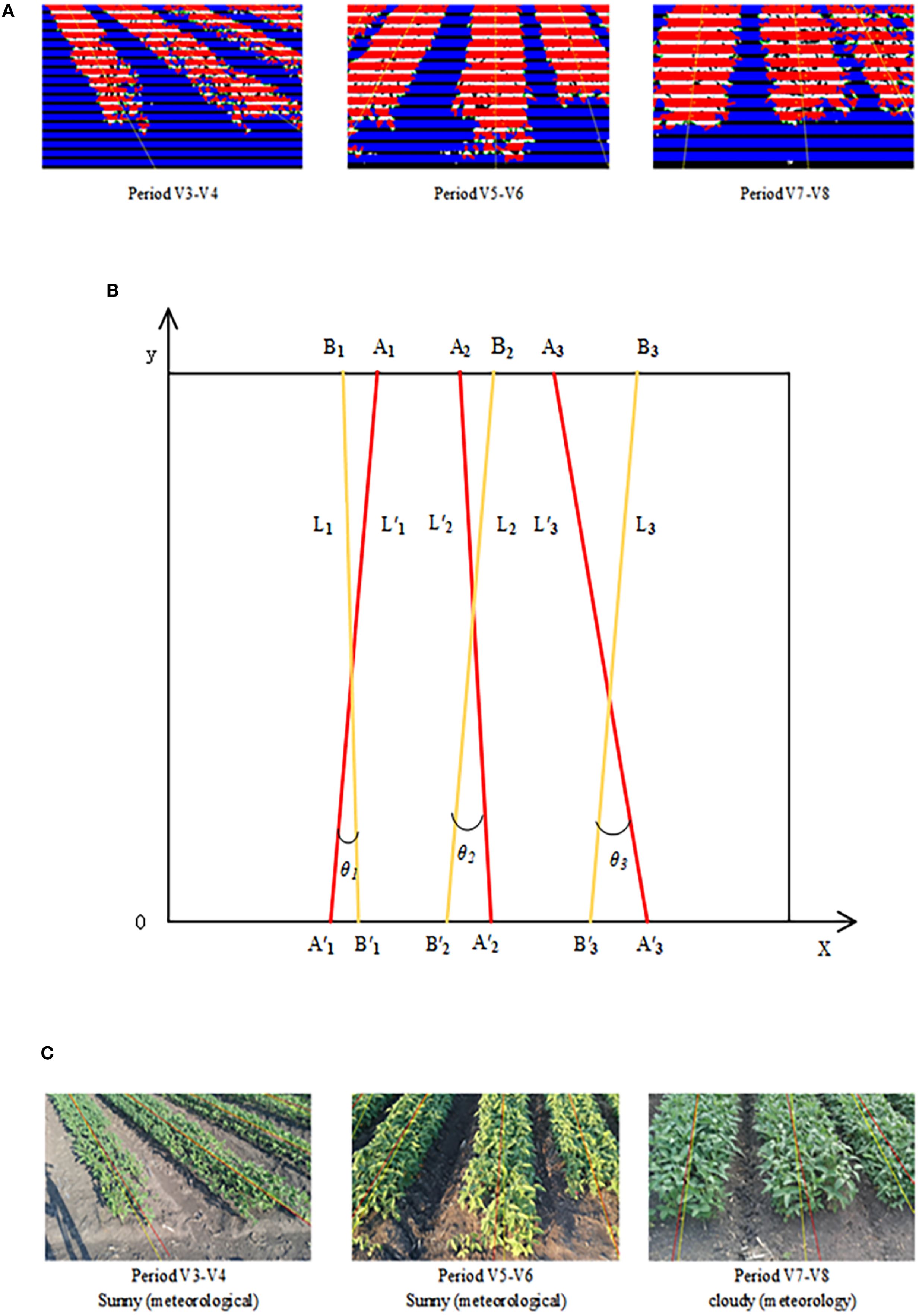 The yellow line represents the crop row fitting results, and the red line represents the standard line, as shown in Figure 14C. The figure contains three images representing the V3–V4, V5–V6, and V7–V8 periods, respectively. Each image displays k sets of lines and their deviation anglesθk (k=1,2, onel from left to right. By calculating θk across the three images from different periods, three sets of angular deviation results (a, b, and c) were obtained, as shown in Table 5. It can be seen that the method proposed in this paper maintained high accuracy for crop rows within the ridge during the V3–V8 period, even under conditions such as clear weather, cloudy weather, and excessive straw. The accuracy of the fitting fluctuated when there were missing plants or incomplete crop rows in the image. The average error in the centerline inclination derived from this method was controlled within –0.473°, which was smaller than the average angular deviation of 0.59° obtained by the crop row centerline detection method based on deep convolutional networks proposed by Gong et al. (2024). The maximum error did not exceed 7.000°, and the mean absolute error (MAE) was 3.309°. These results indicate that the accuracy of the method in fitting a straight line was high, meeting the requirements for fitting crop row direction angles within the ridge.