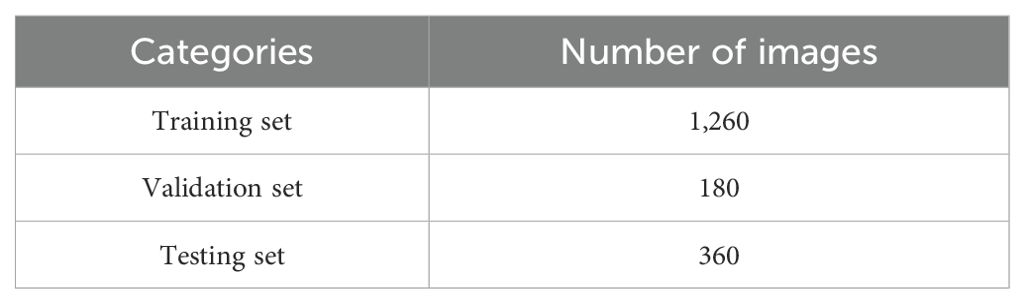 A total of 1,800 images were selected, some of which were cropped. Of these, 600 were from each of the V3–V4, V5–V6, and V7–V8 stages. The LabelImg software was used to annotate the selected images. The annotated rectangular boxes generated corresponding TXT files containing the category as well as the center coordinates, length, and width information of the boxes. The datasets included a category named “headland.” To ensure uniformity, the datasets were randomly divided into 1,260 images for the training set, 180 images for the validation set, and 360 images for the testing set in a 7:1:2 ratio (Table 1). Each dataset contained both image and label information, and sample images are shown in Figure 4.
