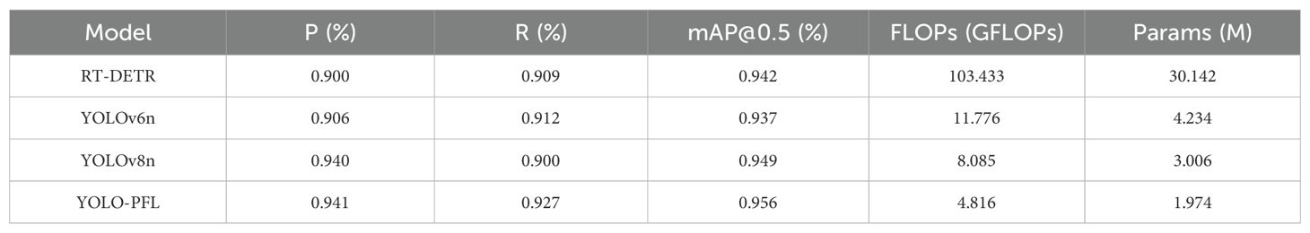 To validate the superiority of the proposed algorithm, comparative experiments were conducted between the improved YOLO-PFL model and RT-DETR, YOLOv6n, and YOLOv8n. The comparison results for each performance index are shown in Table 2.