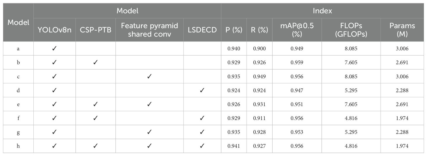 It is worth noting that in certain cases (e.g., models a and c, b and e, d and g, and f and h), Params and FLOPs remained identical despite the addition of extra modules. This phenomenon likely results from shared backbone structures and the implementation of modules such as FeaturePyramidSharedConv and LSDECD, which reuse existing layers via shared weights. Additionally, the YOLOv8 architecture involves implicit layer fusion and model pruning during export or inference, causing some modules to have negligible impact on total parameter count.