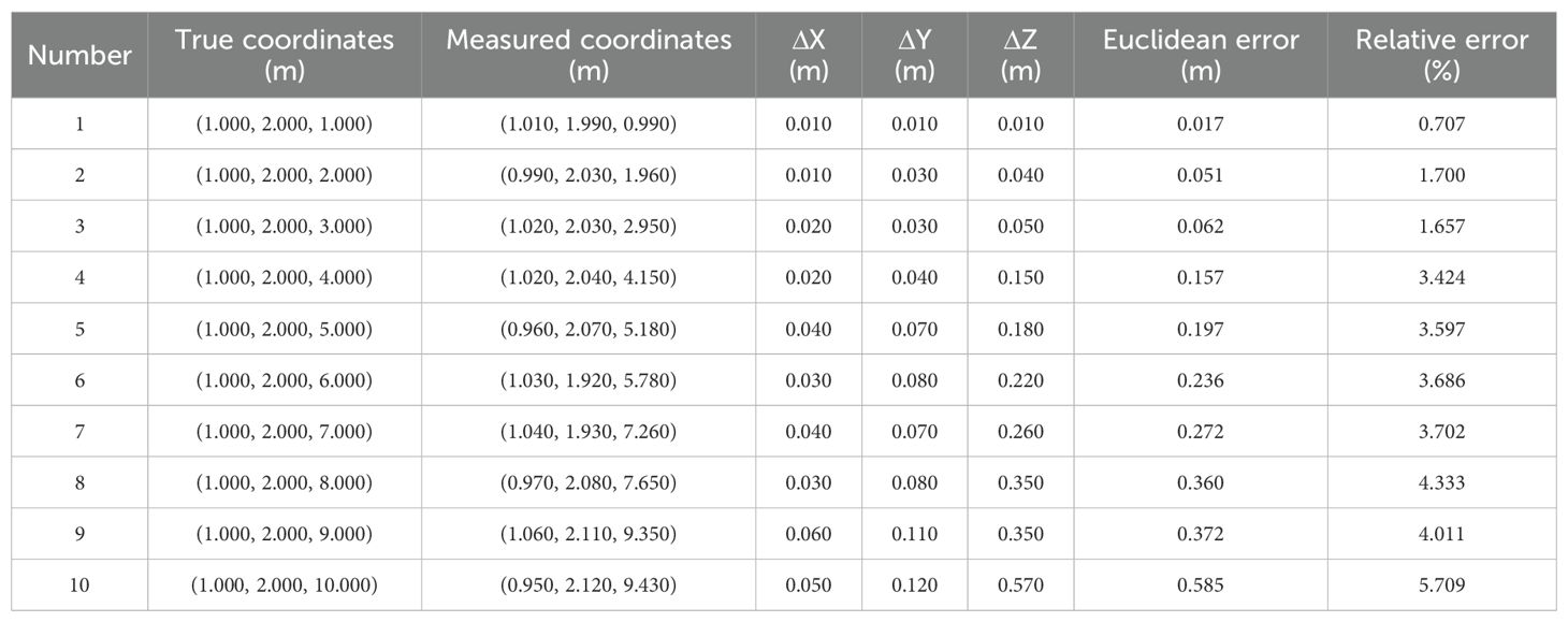 The experiment was conducted under ten different distance conditions: Xactual and Yactual were fixed at 1.000 m and 2.000 m respectively, and Zactual ranged from 1.000 to 10.000 m, as shown in Table 4. By comparing the actual distances with the 3D coordinates at distances ≤3.000 m, within 4.000% at 3.000–7.000 m, and within 6.000% at 7.000–10.000 m. These results indicate good 3D positioning capability.