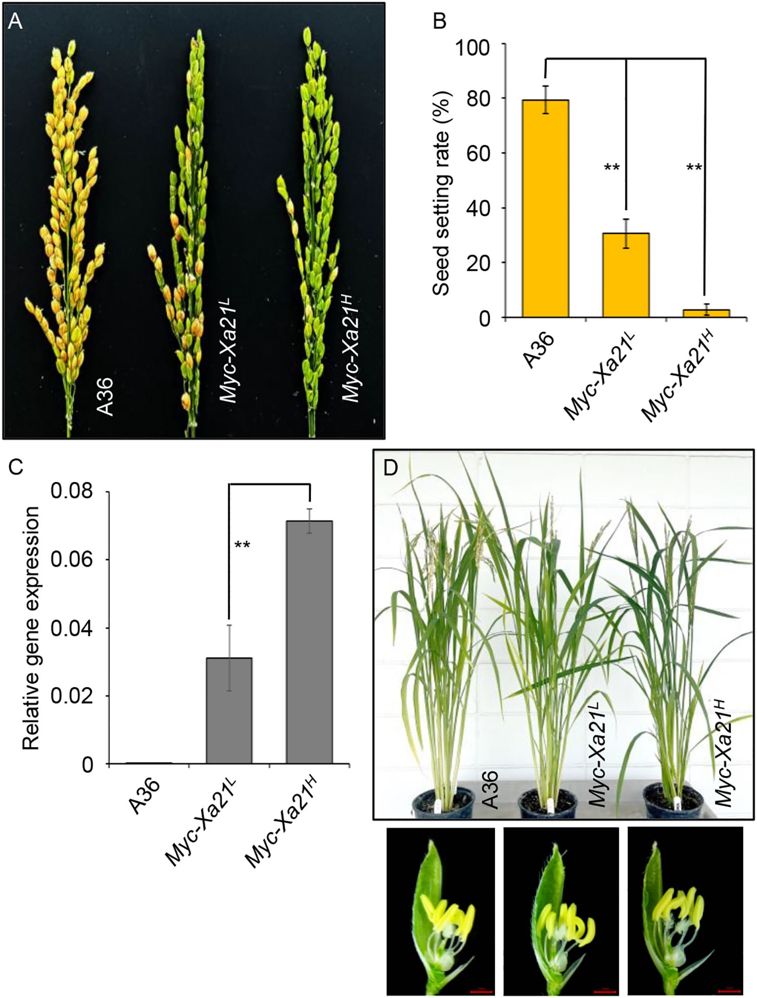 Figure 1. Xa21 decreases grain set in rice at 24°C. (A) Panicle phenotypes of the rice lines A36 (empty vector control), Myc-Xa21L, and Myc-Xa21H. (B) Grain-setting rates of plants in (A) Values are shown as the mean ± SD from five independent plants with two panicles each. Statistical analyses were performed using Student’s t-test. Asterisks denote statistically significant differences (**p < 0.01). (C) Phenotypes of mature plants (top) and floral structures (bottom) of the indicated lines in (A) Scale bars, 1 mm. The experiments were repeated twice with similar results. (D) Relative transcript levels of the Xa21 gene in the spikelets of the indicated lines grown at 24°C at anthesis. Results were normalized relative to levels of the mRNAs for UBIQUITIN 5 and ACTIN. Values are means ± SD of three biological replicates, each with three technical replicates. Statistical analyses were performed using Student’s t-test. Asterisks denote statistically significant differences (**p < 0.01).
