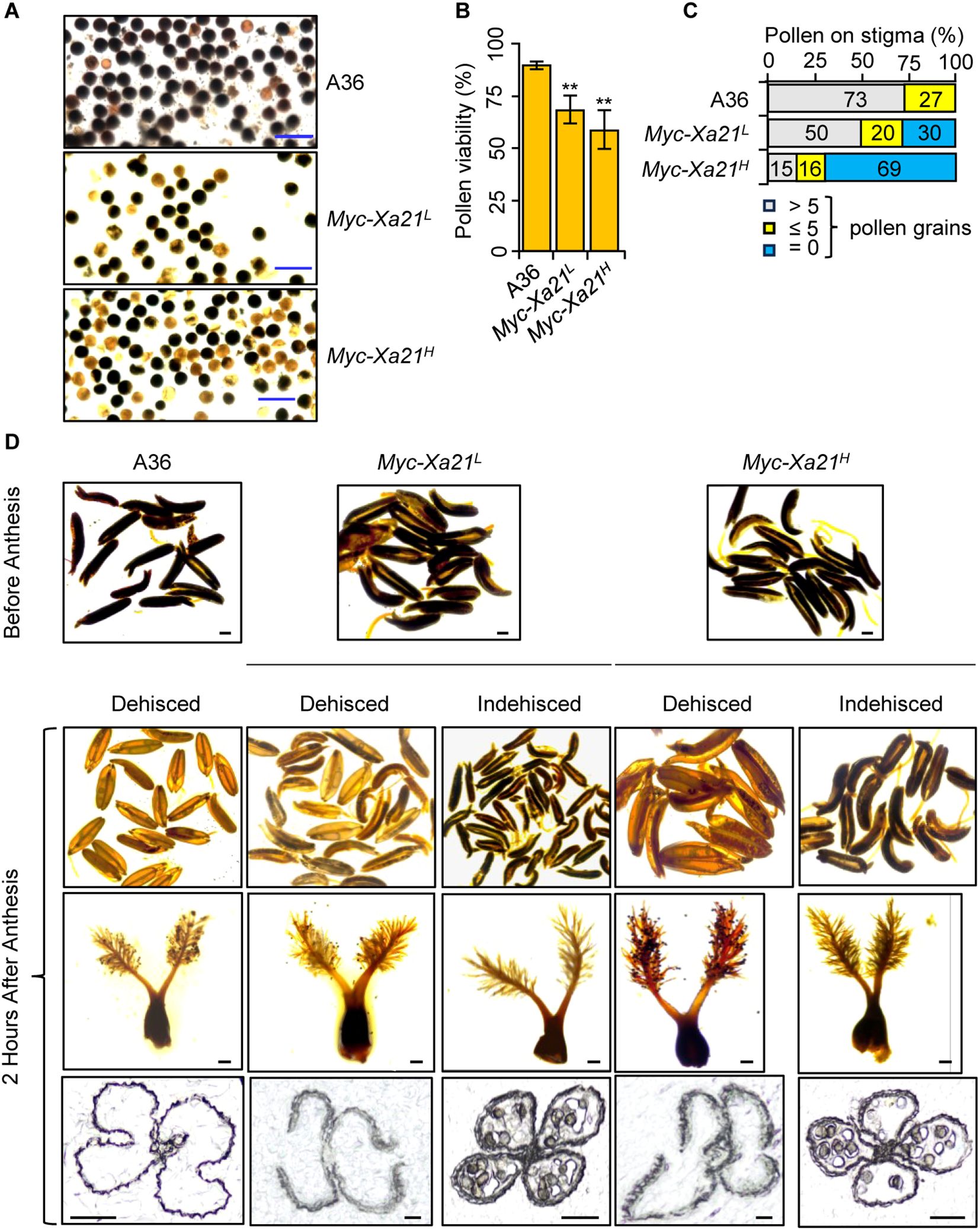 To assess anther dehiscence, we first examined the presence of pollen grains (stained with I2−KI) in the anthers of Myc-Xa21 and A36 plants before anthesis and 2 HAA. To confirm anther dehiscence, we further examined the presence of pollen grains on the stigmas and the breakage of anther walls 2 HAA. Among more than 100 randomly chosen spikelets, most anthers opened in A36 spikelets, and indehiscent ones were rare (Figures 2C, D). In contrast, 30%–69% of spikelets from the Myc-Xa21L and Myc-Xa21H lines were indehiscent 2 HAA. These data demonstrate that Myc-Xa21 plants have a defect in anther dehiscence, which can partially explain the reduced grain set.