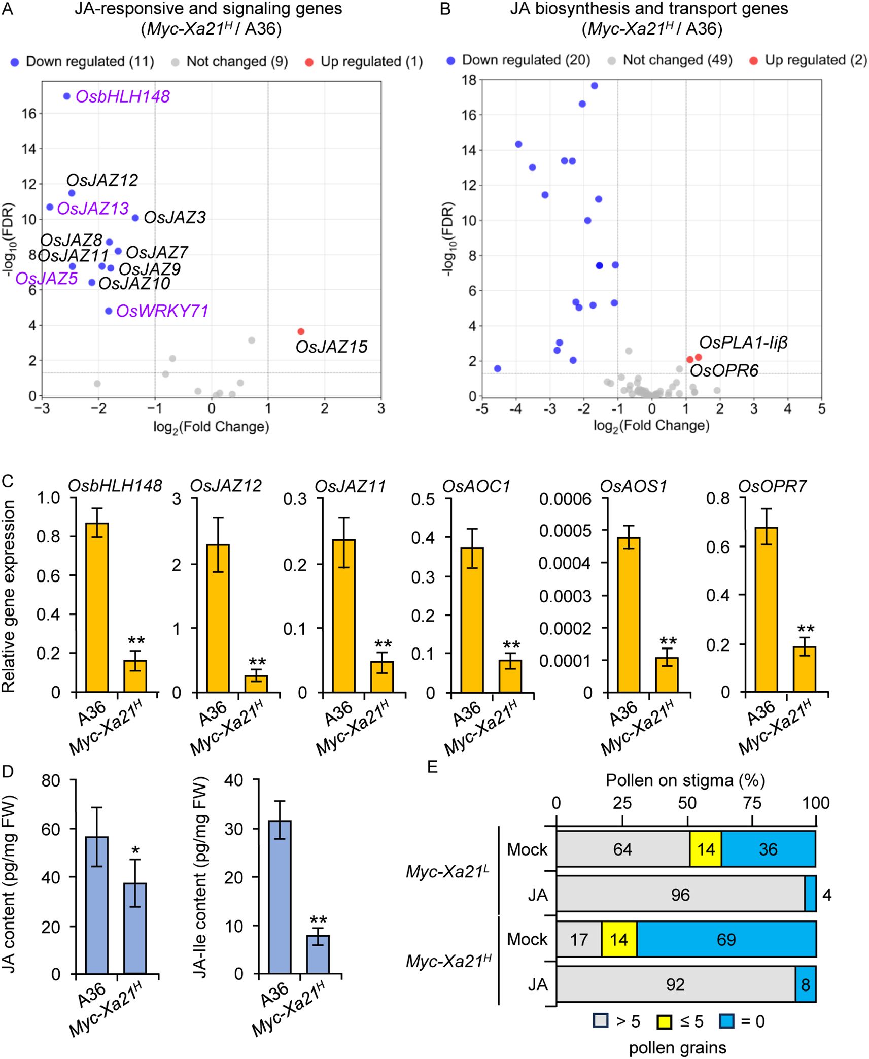 Figure 3. Downregulation of jasmonic acid (JA)-related genes in the indehiscent Myc-Xa21H spikelets relative to the dehiscent A36 spikelets at anthesis at 24°C. (A) RNA-seq volcano plot showing differentially expressed JA-responsive and JA-signaling genes. The genes highlighted in purple are also downregulated in the spikelets of osrblb-b Myc-Xa21H mutant during anthesis (Vergish et al., 2025). (B) RNA-seq volcano plot showing differentially expressed JA biosynthesis and transport genes. Downregulated genes in (B) are OsPLA1α1, OsPLA1α3, OsPLA1β1, OsPLA1β2, OsLOX5, OsLOX6, OsLOX9, OsLOX11, OsLOX12, OsLOXL-2, OsAOS1, OsAOS2, OsAOS3, OsAOC1, OsOPR1, OsOPR7, OsJMT1, OsABCG1, OsABCG22, and OsABCG23. (C) Relative transcript levels, quantified by RT-qPCR, of indicated JA-responsive and JA biosynthesis genes in (A, B) Results were normalized relative to transcript levels of UBIQUITIN 5 and ACTIN. Values are means ± SD of three biological replicates, each with three technical replicates. Statistical analyses were performed using Student’s t-test. Asterisks denote significant differences (**p < 0.01). (D) Relative abundances of JA and JA-Ile, quantified by MS/MS, in the spikelets of the fertile A36 and the semi-sterile Myc-Xa21H. Values are means ± SD of four biological replicates. Statistical analyses were performed using Student’s t-test. Asterisks denote significant differences (**p < 0.01; *p < 0.05). A36 is a transgenic empty vector control. (E) Restoration of anther dehiscence of XA21 plants by exogenous JA treatment at 24°C. Mature panicles of indicated plants were sprayed with either 200 μM MeJA or mock solution. The graph shows the distribution of dehiscent and indehiscent spikelets among 100 random flower samples chosen from five plants of each indicated line at 2 hours after anthesis (HAA).