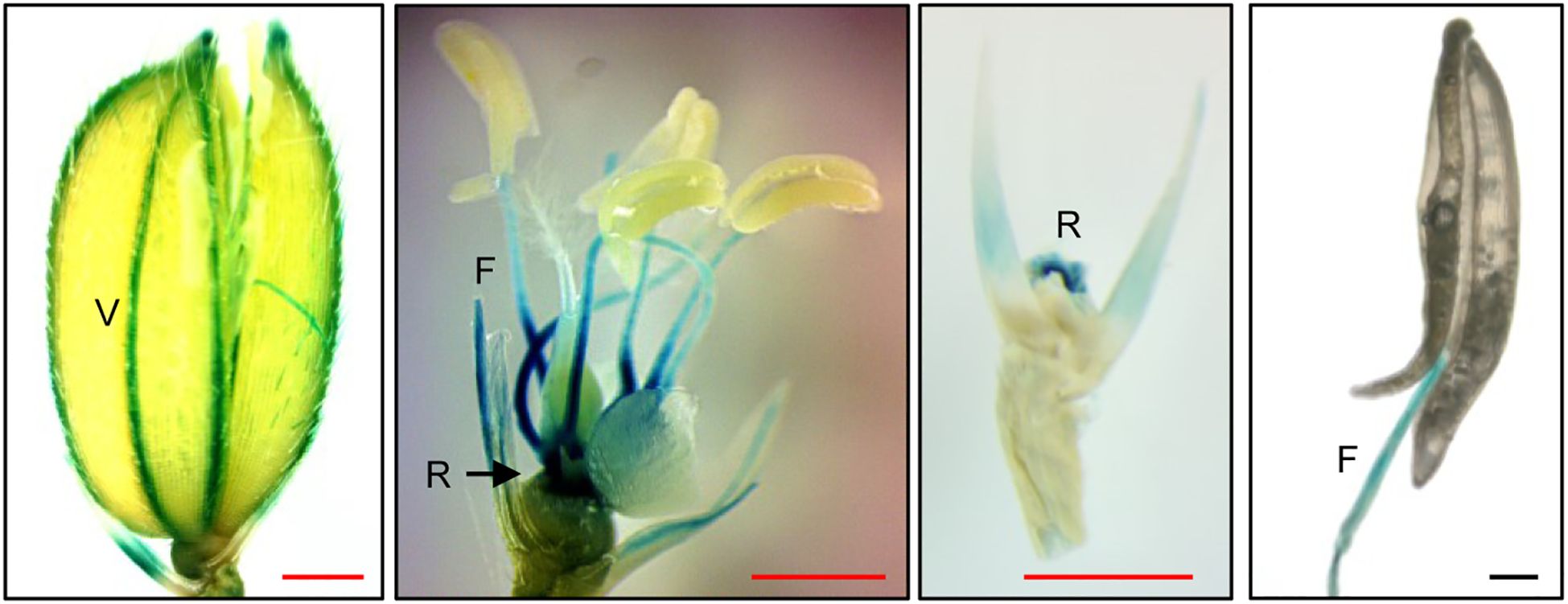 Figure 4. Histochemical analysis of GUS activity from Xa21pro:GUS reporter lines in spikelets. GUS activity was detectable in veins (V) of lemma and palea, in rachillae (R), and in anther filament (F) in the Xa21pro:GUS lines. Scale bars, 1 mm (red), 100 μm (black). Similar results were obtained from two independent (Xa21pro:GUS) lines.