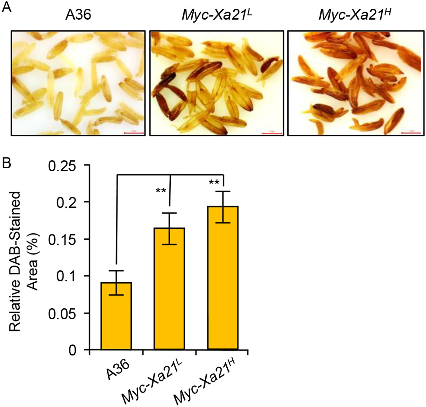 Figure 5. Reactive oxygen species (ROS) production in the anthers of Myc-Xa21 plants at 24°C. (A) 3,3′-Diaminobenzidine (DAB) staining for H2O2 in anthers harvested at anthesis from A36 (empty vector control), Myc-Xa21L, and Myc-Xa21H plants grown. Samples were incubated with DAB solution overnight at room temperature. Scale bars, 1 mm. The experiments were repeated twice with similar results. (B) Quantification of ROS in the DAB-stained anthers of the indicated lines. Values are shown as the mean ± SD from seven anthers. Statistical analyses were performed using Student’s t-test. Asterisks denote statistically significant differences (**p < 0.01).