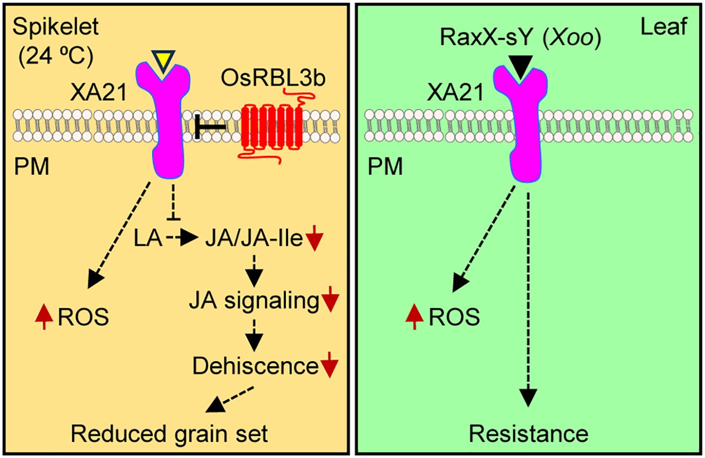 Figure 6. Simplified models of XA21-mediated signaling in spikelets and leaves. In spikelets during anthesis at 24°C, XA21 signaling is activated by an unidentified rice-derived signal (yellow triangle), leading to the production of reactive oxygen species (ROS) and to the suppression of jasmonic acid (JA) biosynthesis from its precursor linolenic acid (LA), which in turn represses JA signaling. Deceased JA signaling compromises anther dehiscence, ultimately resulting in reduced grain set. In leaves, XA21-mediated signaling is activated by the Xoo peptide RaxX-sY, which results in ROS production and resistance to Xoo. As described recently (Vergish et al., 2025), the rhomboid protease OsRBL3b prevents the over-accumulation of XA21 in rice spikelets.