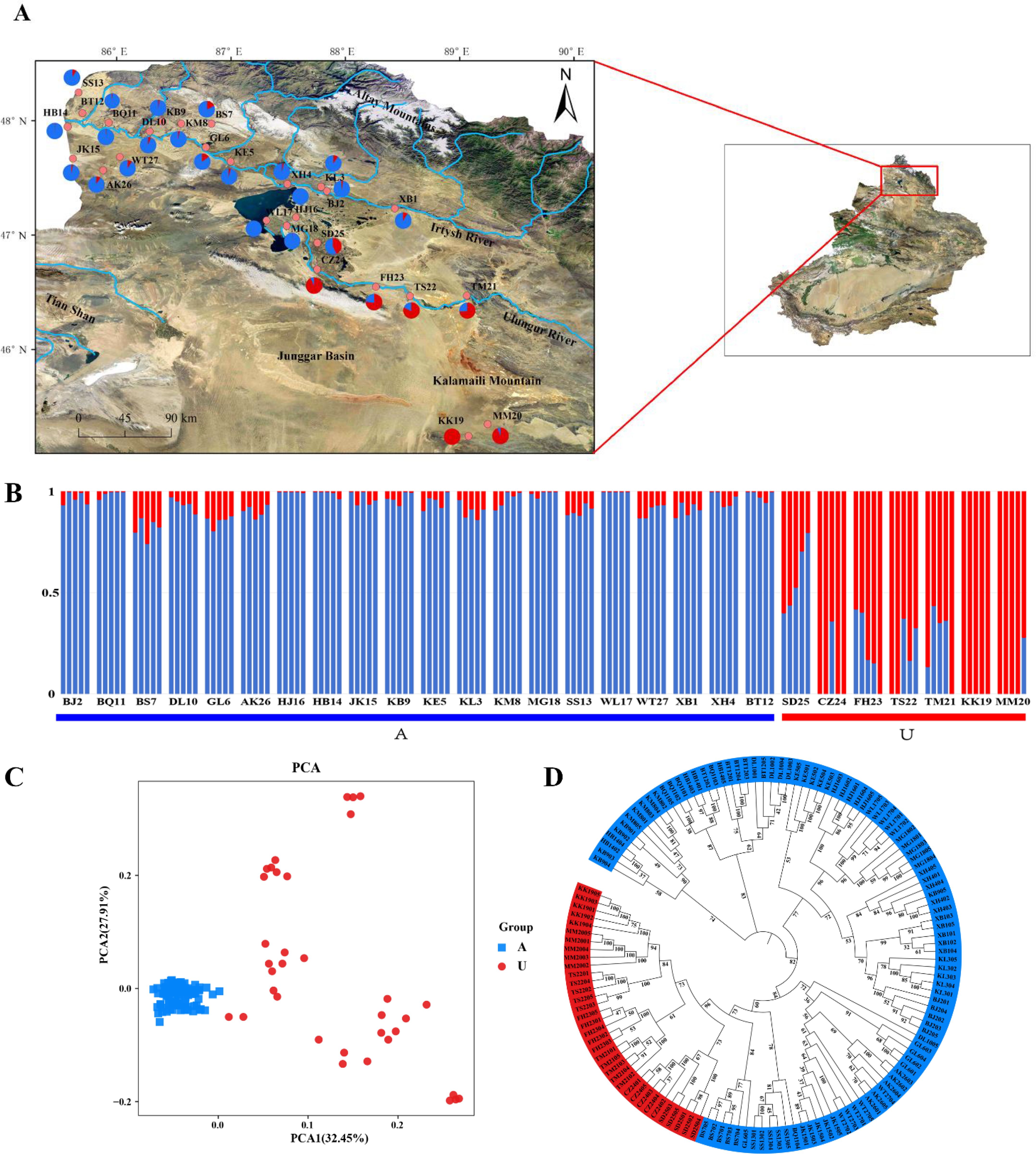 Figure 2. Genetic structure analysis of 27 populations and 135 individuals of Leymus racemosus. (A), The geographical locations of 27 Leymus racemosus populations. The pie chart shows the average proportion of the two genetic lineages identified in each group. Blue represents lineage A and red represents lineage U. (B), ADMIXTURE phylogenetic typing. The blue and red bars represent the likelihood Q values of lineages A and U respectively. (C), Principal component analysis (PCA). (D), Neighbor-Joining (NJ) phylogenetic tree.
