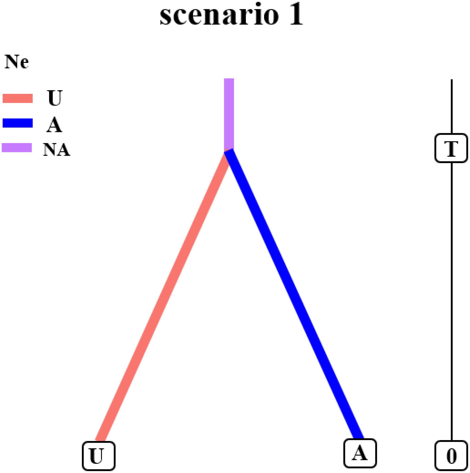 We employed Approximate Bayesian Computation (ABC) as implemented in DIYABC v2.1.0 to evaluate three evolutionary scenarios for L. racemosus. Our analysis provides the strongest support for Model 1, which best explains the divergence of the A and U lineages (Figure 3; Supplementary Figure S4; Supplementary Tables S4, S5). The divergence time was estimated by scaling the expected value of the time parameter (t) by the generation time of L. racemosus. This analysis indicates that the A and U lineages diverged from a common ancestor approximately 0.0295 million years ago (Mya; 95% CI), during the mid-Pleistocene. These historical events have shaped the current phylogeographic structure, wherein the distribution of lineage U is centered in the Ulungur River basin, while lineage A is predominantly found in the Irtysh River basin.