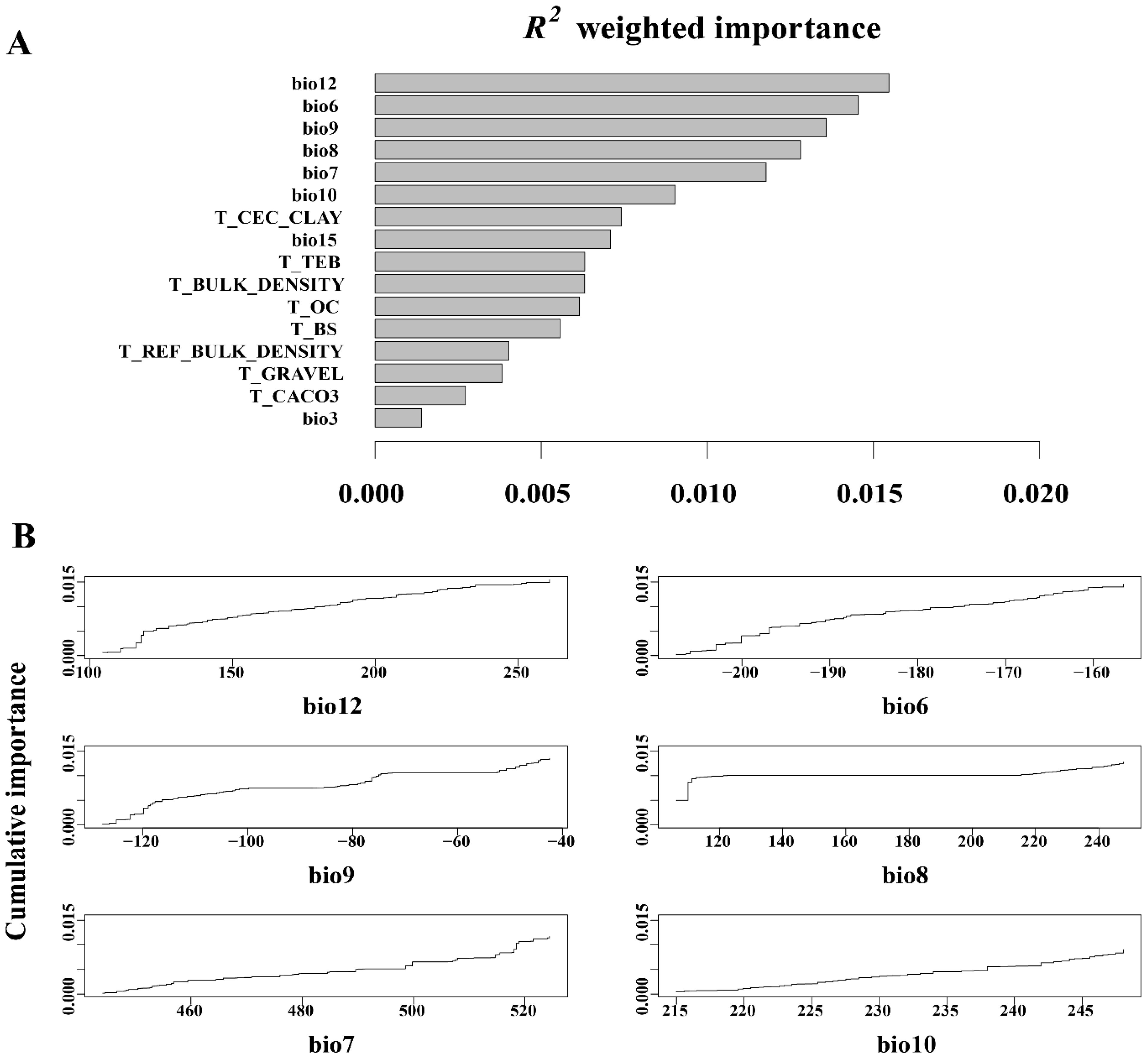 Figure 4. Leymus racemosus gradient forest (GF) analysis. (A), R2-weighted importance of environmental variables that elucidate genetic gradients; (B), The cumulative importance of allele variation in the first six environmental gradients.