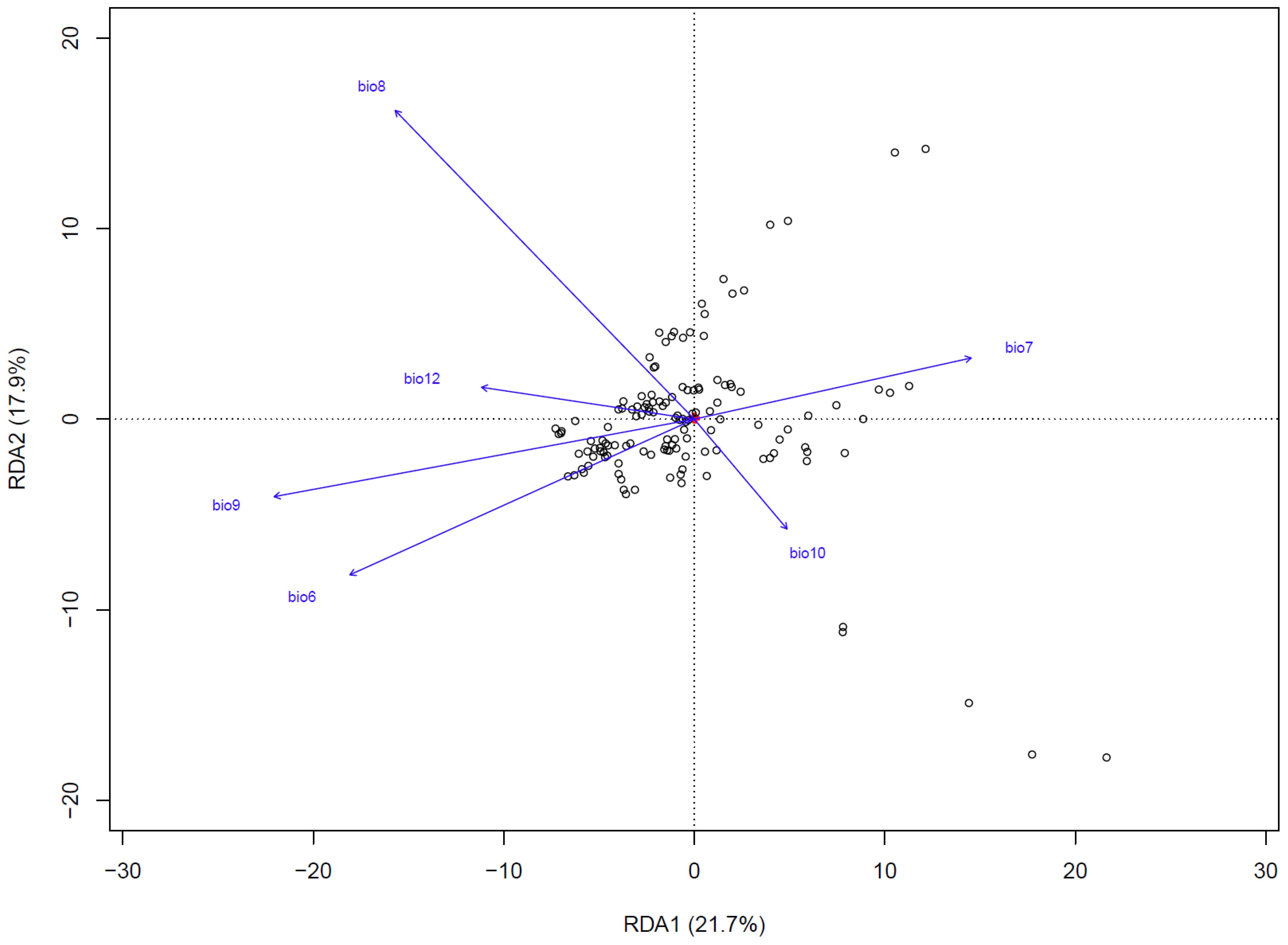 Figure 5. Redundancy analysis (RDA) of the relationship between 6 important environmental factors and genetic variation in Leymus racemosus. White circle, different individuals; small red points (located at the center of the figure), single nucleotide polymorphism (SNP) site.