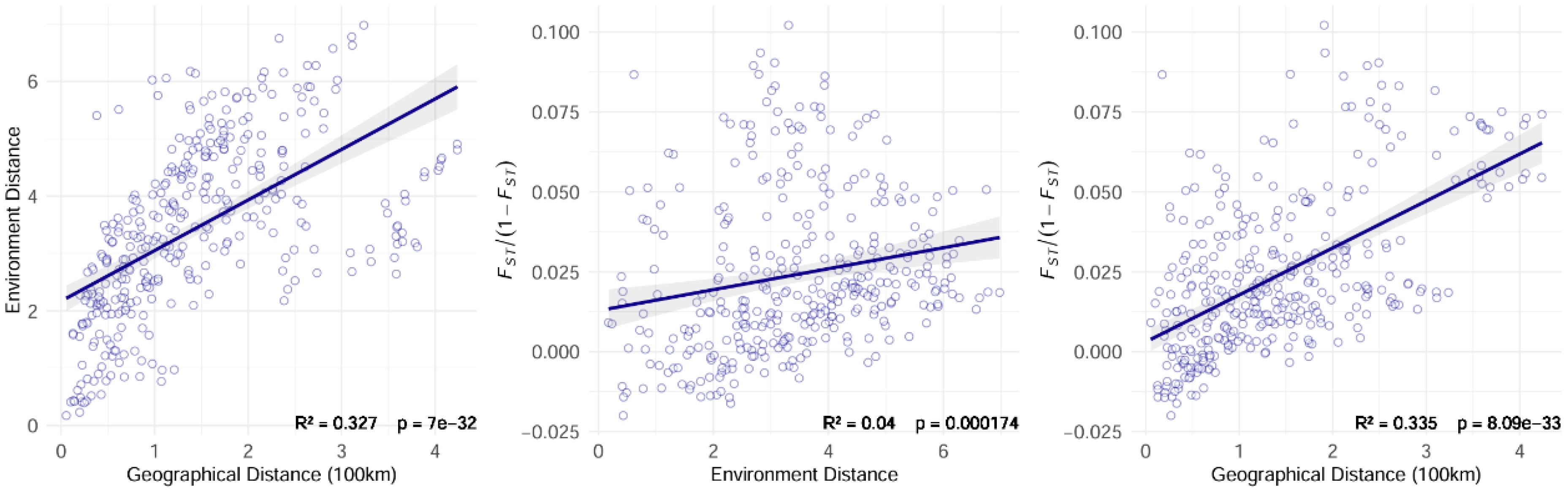 The Mantel test was employed to assess potential patterns of Isolation by Distance (IBD) and Isolation by Environment (IBE) in Leymus racemosus populations, evaluating the correlation between genetic distance and both geographical and environmental distances. Genetic distance was calculated using the population differentiation index (FST), with a linearized FST/(1 - FST) transformation applied to quantify genetic distance. The geographical distance between populations was determined using the R package geosphere (Karney, 2013). Eight climate factors and eight soil factors, extracted from the HWSD and PaleoClim databases, were utilized to compute the Euclidean distance matrix between the variables. The R package vegan was employed to conduct 1000 permutation tests (Dixon, 2003) on the genetic distance matrix and the geographical or environmental distance matrices, calculating the correlation coefficient (r) and its significance level (p-value). Scatter plots and trend lines depicting genetic distance versus geographical or environmental distance were generated to illustrate significant correlation patterns.