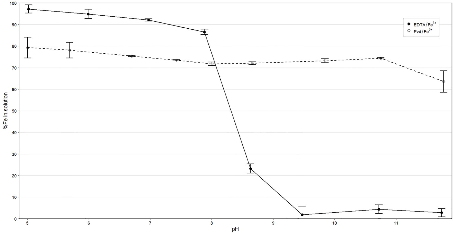 Under alkaline conditions, Pvd/Fe³+ showed a largely pH-insensitive solubility profile: the fraction of Fe remaining in solution declined only from ~79% at pH 5.0 to ~64% at pH 11.8, whereas EDTA/Fe³+ remained high near neutrality but dropped sharply above pH 8 (Figure 2). These results indicate that Pvd/Fe³+ better preserves soluble (bioavailable) Fe across alkaline pH. For the correct interpretation of the results, the different chemical species of chelating agents formed, as a function of pH, will be discussed. The pyoverdines are a family of siderophores characterized by a common structure, comprising a chromophore, a peptide sequence, and an acyl side chain (Soares, 2022). The main difference in the interaction with Fe of the different pyoverdines lies in the peptide sequence, as it could interact with Fe via hydroxamate or α-hydroxycarboxylate groups.