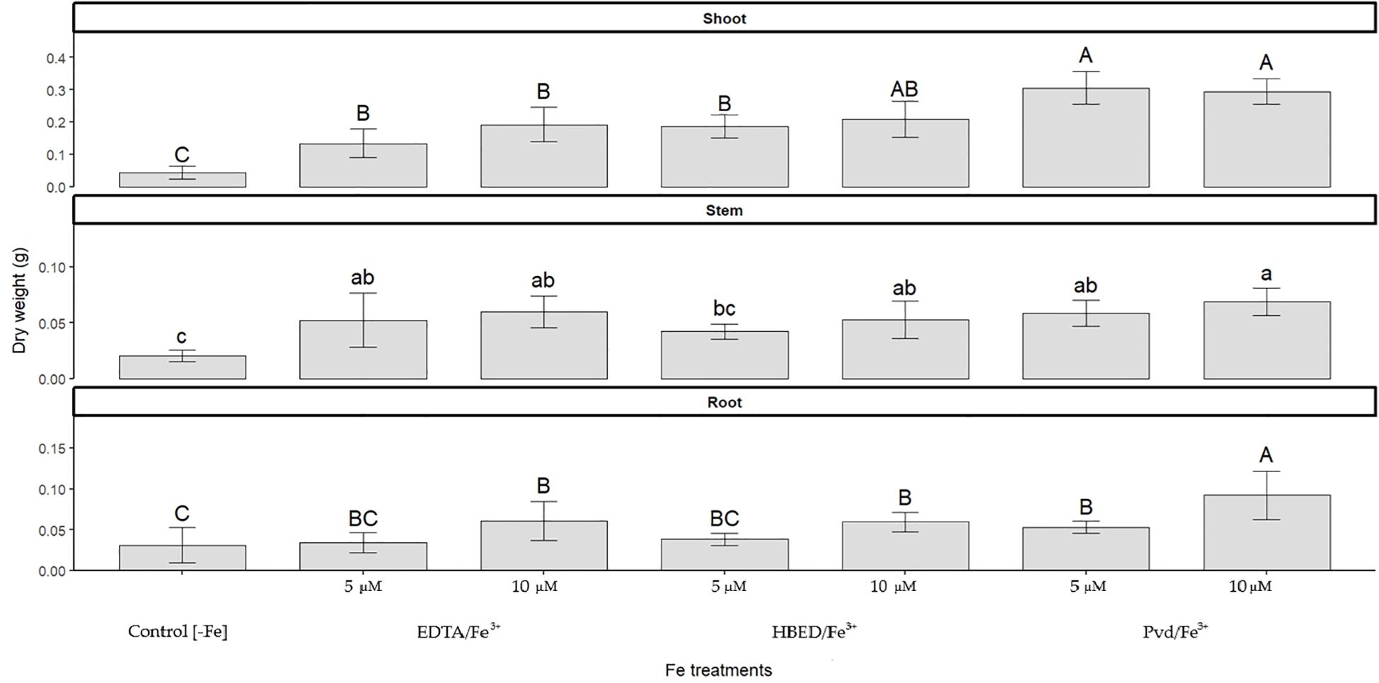 Figure 3. Dry weight of shoots, stems, and roots of cucumber plants grown under Fe-deficient conditions (Control [–Fe]) or supplied with Fe3+ as EDTA, HBED, or Pvd at 5 or 10 μM. Bars represent mean values (n=5) ± SE. Different letters within each panel indicate significant differences among treatments according to Duncan’s test (p < 0.05).