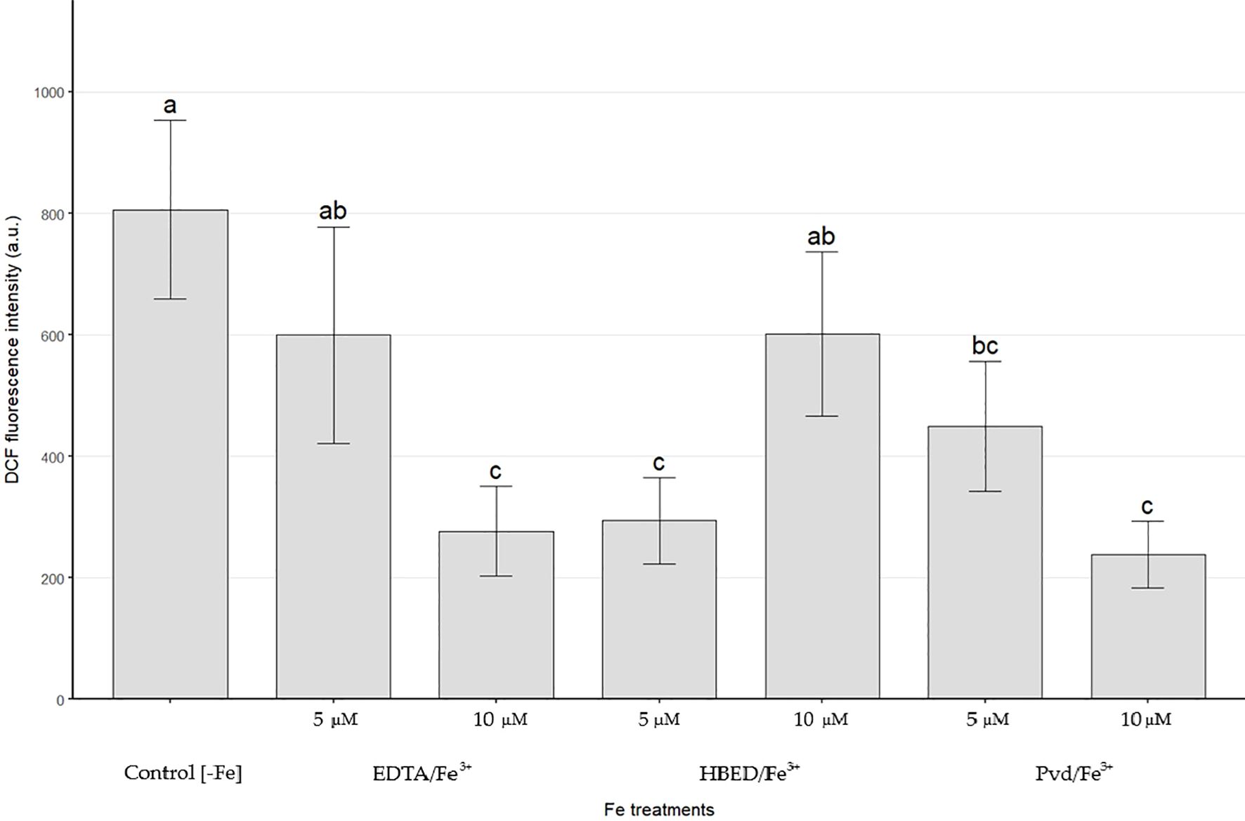 Leaf ROS was quantified by H2DCFDA oxidation to DCF. Fluorescence was used as a proxy for ROS/oxidative status (Figure 4). The –Fe control showed the highest signal, significantly exceeding EDTA/Fe³+ 10 µM, HBED/Fe³+ 5 µM, and PVD/Fe³+ (5 and 10 µM). It did not differ from EDTA/Fe³+ 5 µM or HBED/Fe³+ 10 µM. Among Fe-supplied treatments, the lowest ROS levels were observed for EDTA/Fe³+ 10 µM, HBED/Fe³+ 5 µM, and PVD/Fe³+ 10 µM.