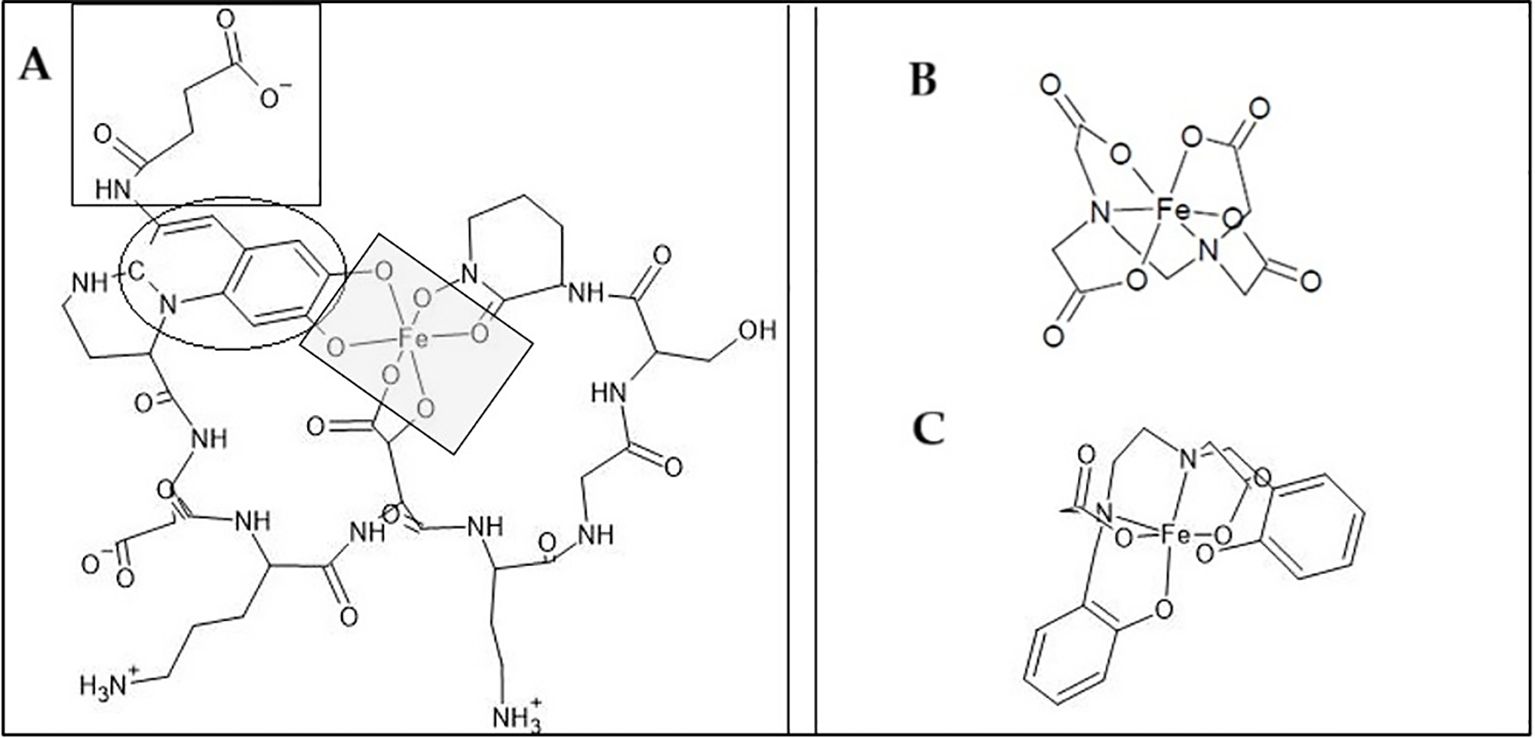 Figure 5. Structure of different Fe chelates. (A) Biochelate Pvd-Fe based on pyoverdine produced by Pseudomonas putida ATCC 33015, structure adapted from (Boukhalfa et al., 2006). The grey square represents Fe bonds, the black circle represents the chromophore group, and the black square represents the side acyl chain. (B) EDTA-Fe chelate. (C) HBED-Fe chelate. The structures were created using the software ACD/ChemSketch.