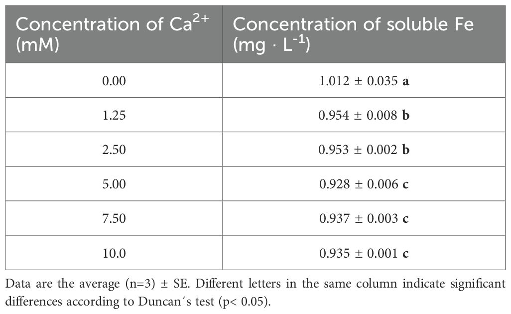 Table 2. Concentration of soluble Fe (mg · L-1) of Pvd/Fe3+ biochelate at different Ca2+ concentrations (mM) and pH 8.0.