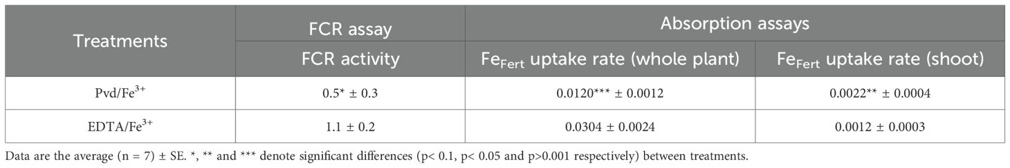 Table 4. FCR activity and FeFert uptake rate of plants, both expressed as µmol Fe · h-1 · g−1 root fresh weight, treated with Pvd/Fe3+ and EDTA/Fe3+ in the experiment of Fe Root reduction and 57Fe uptake.