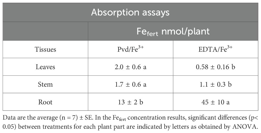 Table 5. Fe from Pvd/Fe3+ and EDTA/Fe3+ (Fefert) in the different plant parts (nmol Fe ·plant-1) determined after two hours exposure to 57Fe treatments.