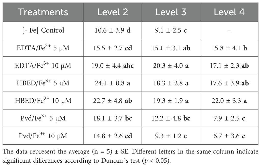 SPAD dynamics in level 2 leaves showed no treatment differences from day 0-4. By day 8, all Fe-supplied treatments exceeded the -Fe control. HBED/Fe3+ (5 and 10 µM) consistently produced the highest SPAD values through day 14. The -Fe control declined steadily from 18.42 to 10.57 SPAD units (Δ = -7.85), indicating progressive chlorosis (see Supplementary Table S1, in Supplementary Materials), whereas chelated Fe maintained or increased SPAD. No chelated treatment matched the control´s loss; the most significant decline among them occurred with Pvd/Fe3+ 10 µM (Δ = -4.28), still substantially smaller than the control (see Supplementary Table S1). The comparative values of the SPAD indices obtained on day 14 are shown in Table 6.