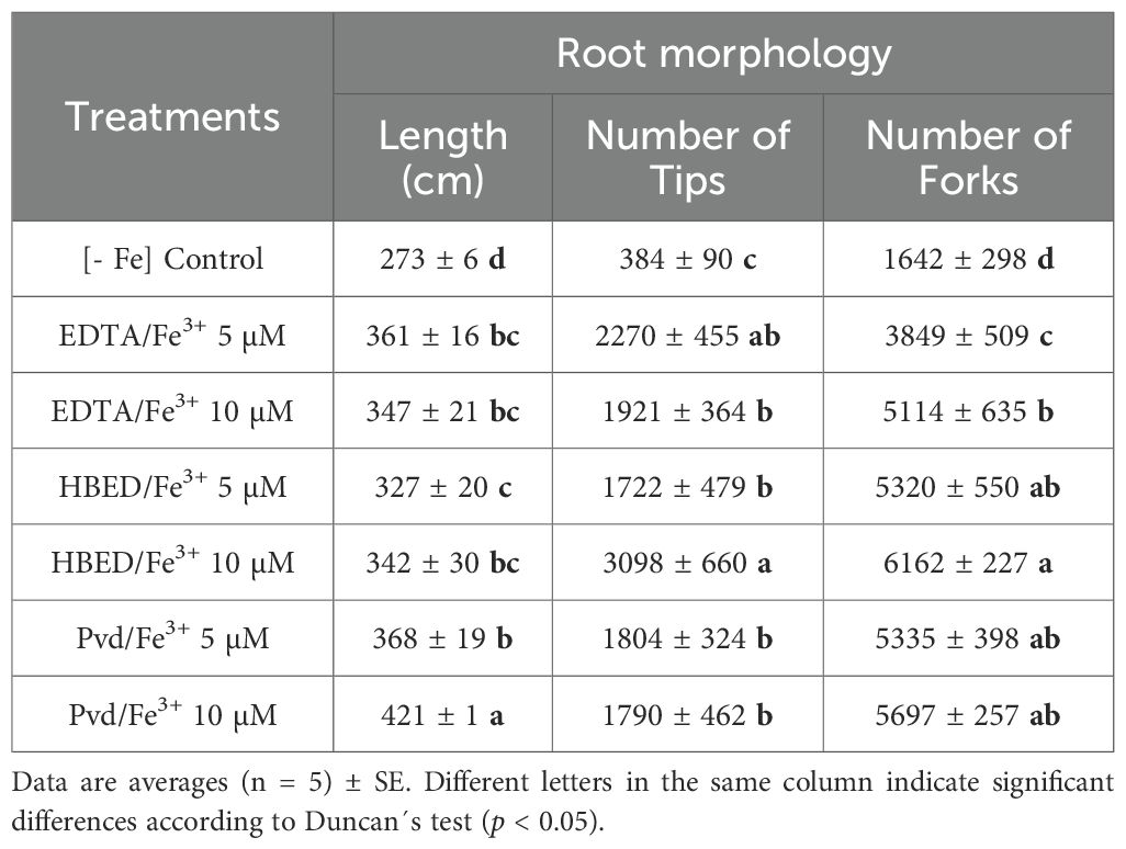 The control –Fe plants exhibited the shortest root length (Table 7), thereby indicating the adverse effect of Fe deficiency on root elongation. The application of the Pvd/Fe3+ at 10 µM resulted in the longest roots, suggesting that this treatment effectively enhanced root elongation. The number of root tips, which indicates root branching and exploratory capacity, was significantly higher in all plants treated with Fe. Those treated with HBED/Fe3+ at 10 µM presented the highest values. The number of root forks, which denotes the points at which roots divide, was also significantly higher in the HBED/Fe3+ 10 µM.