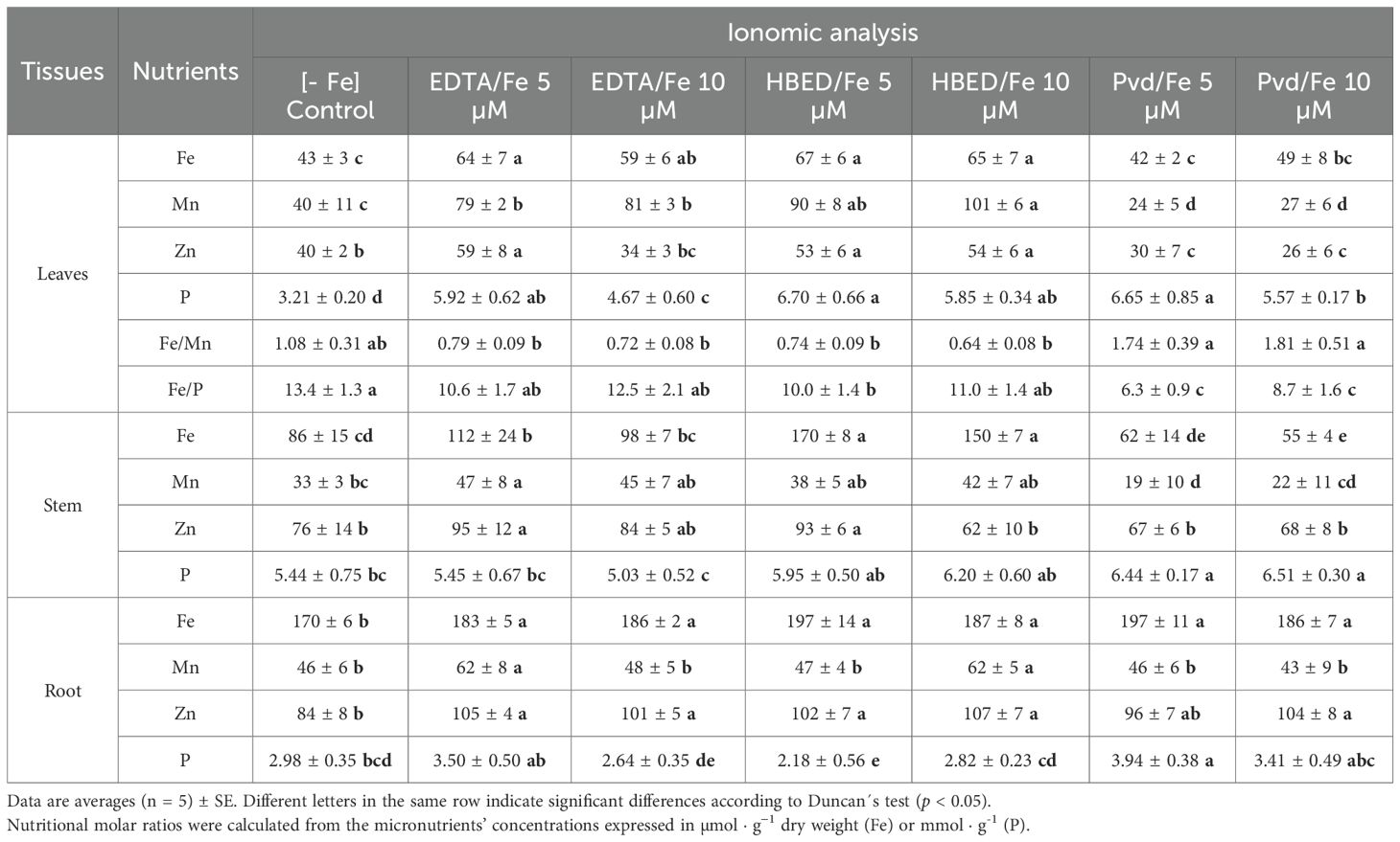 In stems, Pvd/Fe3+ presented the lowest Fe concentrations, indicating a low accumulation in this plant tissue. Manganese levels were again reduced, consistent with leaf data. Pvd/Fe3+ also promoted the highest P accumulation in stems, suggesting improved nutrient translocation.