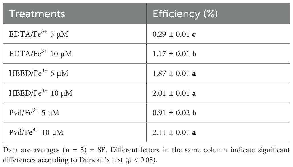 To evaluate Fe supply efficiency, total Fe concentration across tissues was normalized to plant dry weight, corrected by subtracting values from Fe-deficient controls, and expressed as a percentage of Fe supply efficiency (Table 9). Pvd/Fe3+ (10 µM) demonstrated high Fe efficiency, comparable to HBED/Fe3+ (10 µM), and higher than EDTA/Fe3+. These results are consistent with the increased biomass observed under Pvd/Fe3+ (Figure 3), which probably led to a dilution effect on nutrient concentrations, thus explaining the moderate Fe levels reported in Table 8.