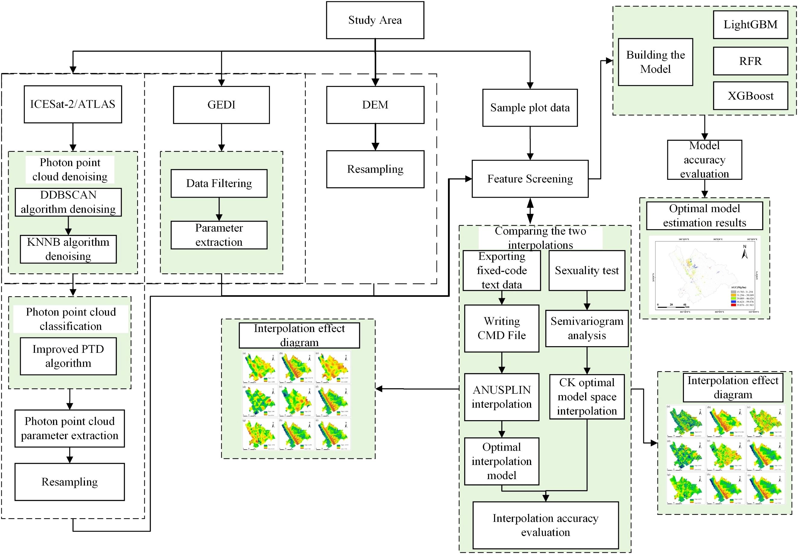 This study employed ANUSPLIN software to interpolate spaceborne LiDAR GEDI and ICESat-2/ATLAS footprint data and compared its performance with CK. A remote sensing estimation model was then constructed to estimate the AGC of Dendrocalamus giganteus based on the optimal model (Figure 3).