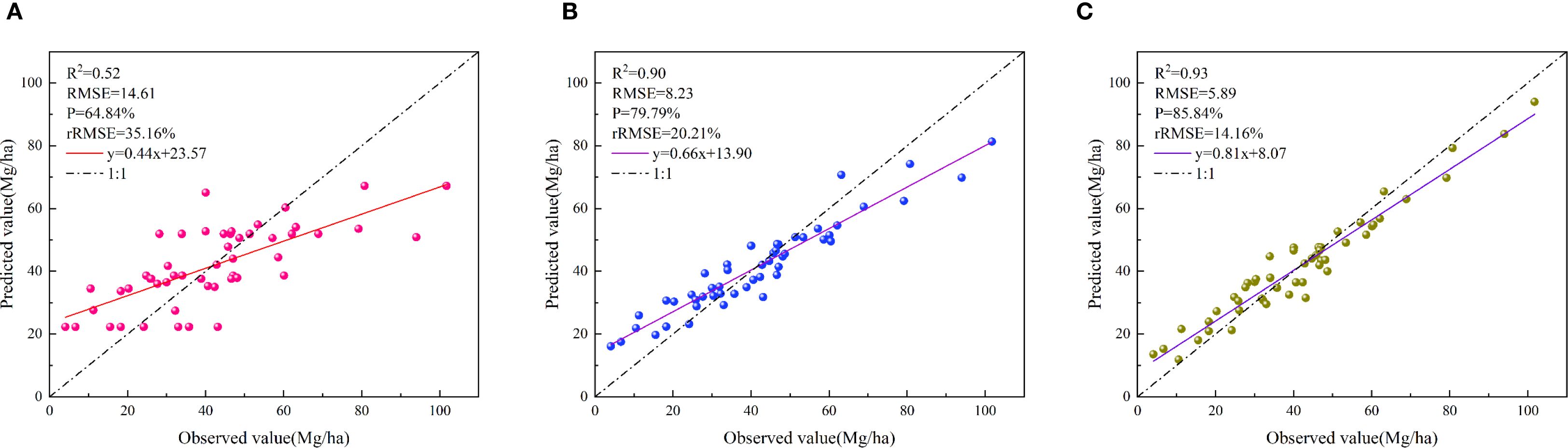 This study uses ten-fold cross-validation and evaluates the fitting performance of the constructed regression models using four accuracy metrics: Coefficient of Determination (R2), RMSE, Overall Estimation Accuracy (P), and relative RMSE (rRMSE). The calculation formulas can be found in Reference Qin et al. (2025).