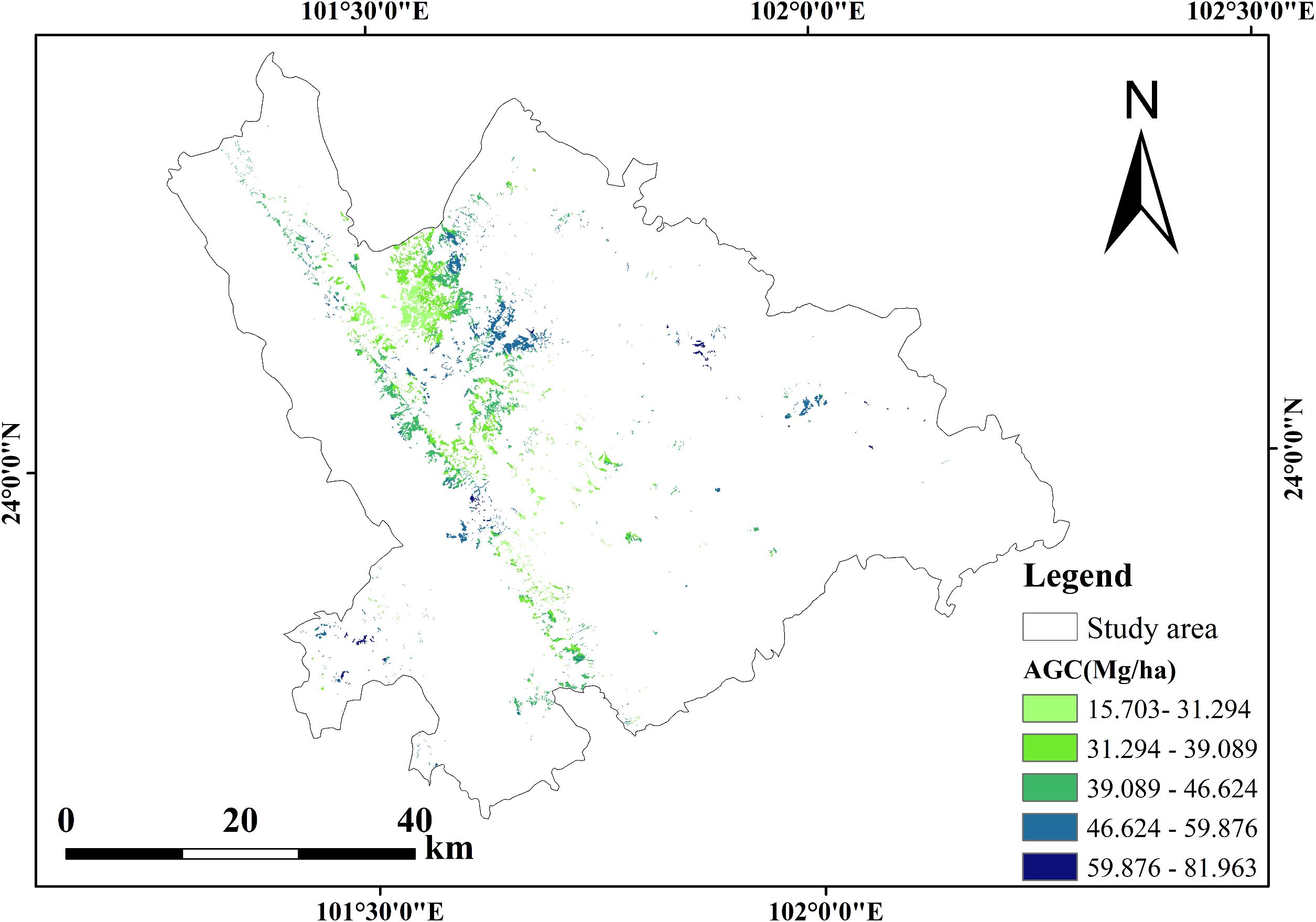 In these 51 plots, the minimum, maximum, mean, and standard deviation of Dendrocalamus giganteus AGC were 4.08 Mg/ha, 101.78 Mg/ha, 41.63 Mg/ha, and 20.55 Mg/ha, respectively, with the calculation procedure following Yang et al. (2024a).