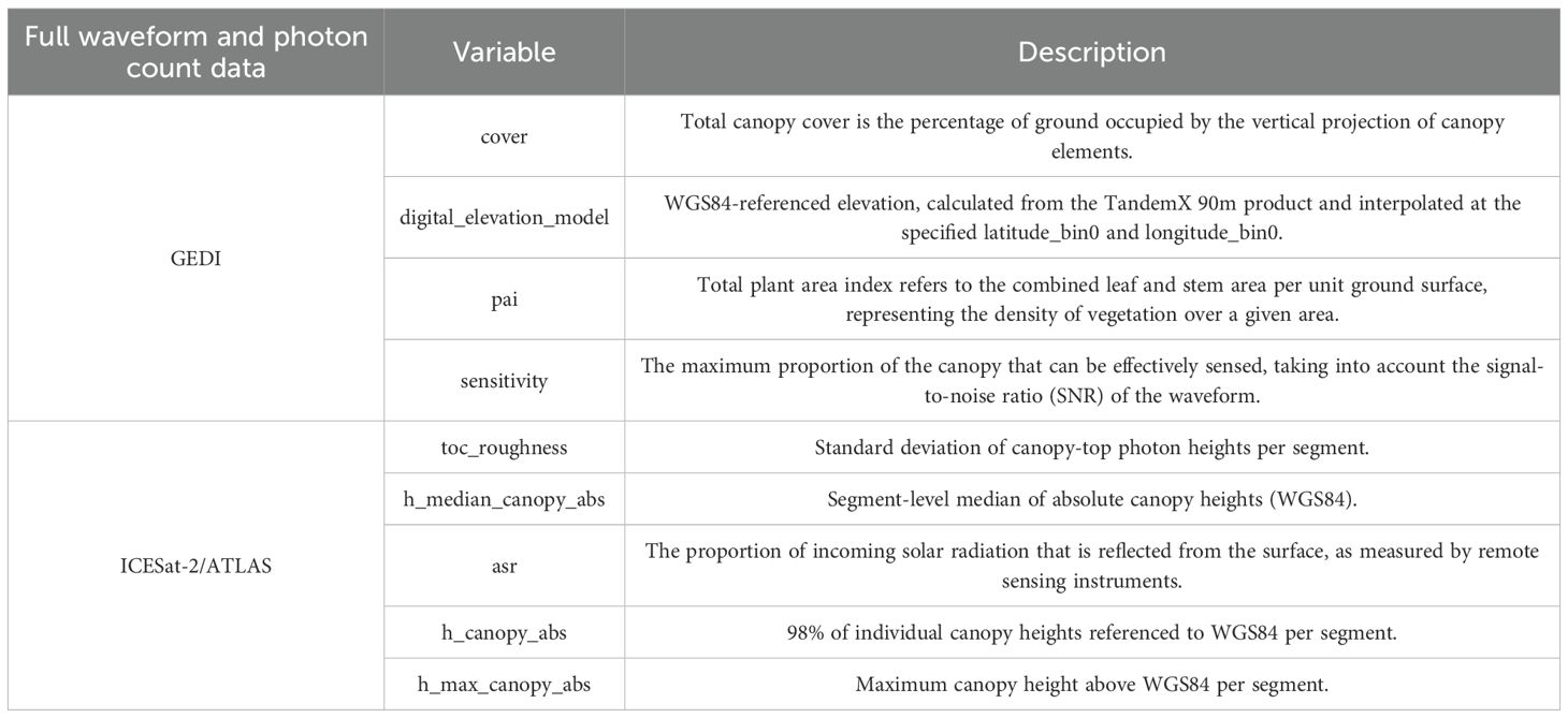 The GEDI is the first full-waveform spaceborne LiDAR system aboard the International Space Station. It is an active remote sensing technology capable of collecting large-scale data. Using short-wavelength laser pulses, GEDI penetrates the forest canopy to obtain precise three-dimensional forest structure information (Dubayah et al., 2020). Its sampling range extends from 51.6°N to 51.6°S, enabling the inversion of forest structure parameters in all regions except high-latitude areas (Wang et al., 2024). This study utilized the GEDI L2B data product, which is available for download from the official website (https://www.earthdata.nasa.gov). The data used in this study covered the study area from January 2022 to February 2023 and included all accessible swath data. The data is stored in HDF5 format with a spatial resolution of 25 m and consists of discrete laser footprints.
