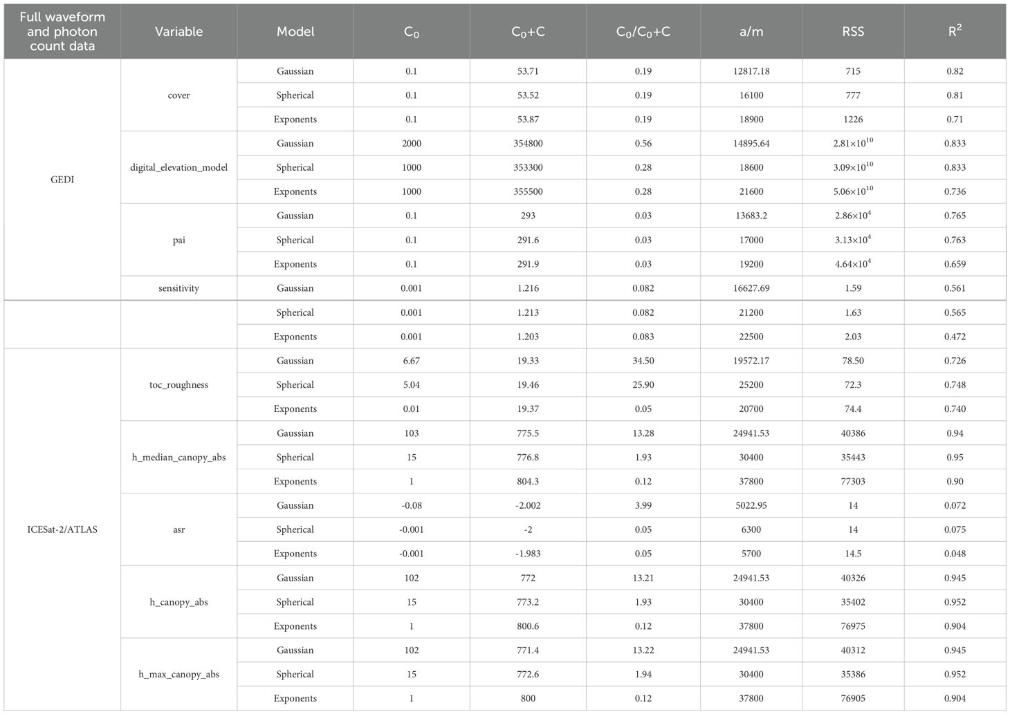Select the interpolation model based on the optimal principle of the semivariogram function (Qin et al., 2025), Table 4 shows the following: For the four GEDI parameters—cover, digital_elevation_model, pai, and sensitivity—the optimal model was the Gaussian model. For the five ICESat-2/ATLAS parameters—toc_roughness, h_median_canopy_abs, asr, h_canopy_abs, and h_max_canopy_abs—the optimal model was the Spherical model. Among the nine parameters, only GEDI’s digital_elevation_model and ICESat-2/ATLAS’s h_median_canopy_abs exhibited block effects in the range of 25% - 75%, indicating moderate spatial autocorrelation. The other seven parameters showed strong spatial autocorrelation.