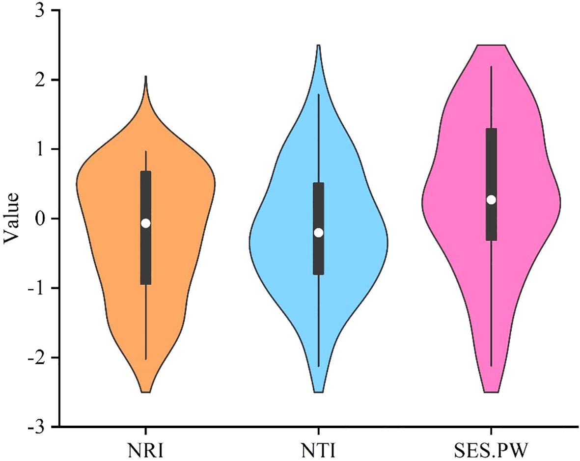 The net relatedness index (NRI), net nearest taxa index (NTI) and mean pairwise trait distance (SES.PW) were employed to calculate the phylogenetic and functional trait structure of trees in different quadrats by the R software picante package. Values of NRI and NTI exceeding 0 suggest phylogenetic structure of species aggregation, while those less than 0 indicate phylogenetic structure of species divergence. A value of 0 for both NRI and NTI implies a random distribution of phylogenetic structure of species (Elliott et al., 2016). When SES.PW exceeds 0, it suggests that the functional trait structure is aggregated. Conversely, if SES.PW falls below 0, it implies a divergent functional trait structure. A value of SES.PW equal to 0 indicates a random functional trait structure (Hanz et al., 2022).