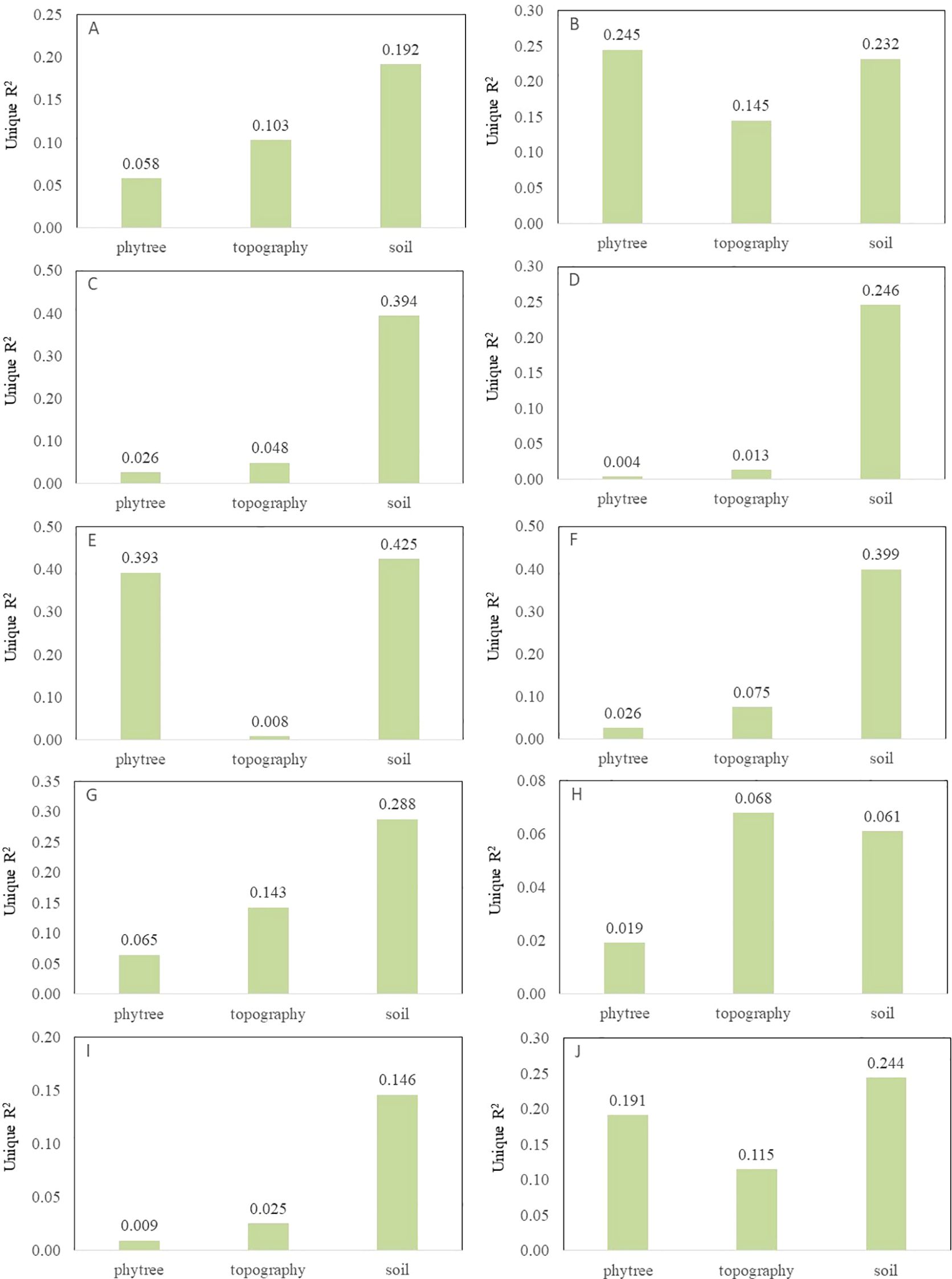 Figure 4. The individual explanatory rates of phylogenetic development, topographic and soil factors for 10 plant functional traits ((A) leaf area, (B) leaf carbon, (C) leaf length-width ratio, (D) leaf dry matter content, (E) leaf nitrogen, (F) leaf phosphorus, (G) leaf tissue density, (H) leaf thickness, (I) specific leaf area, (J) wood density).