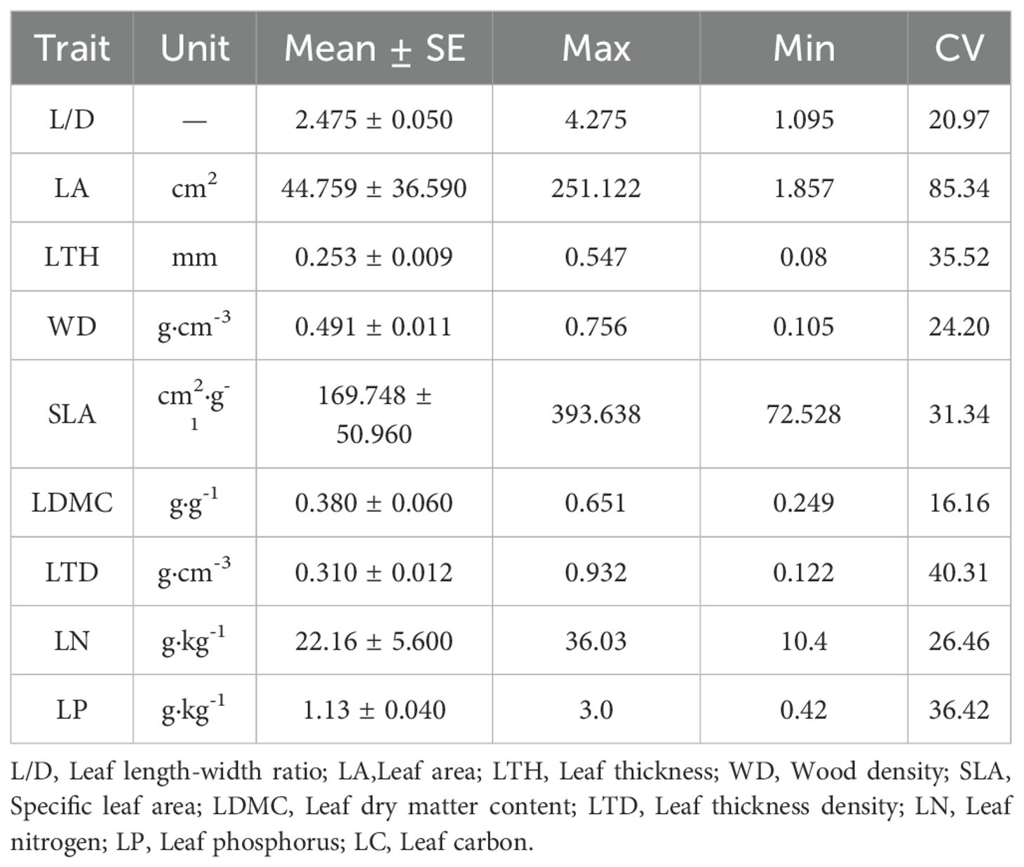 A sum of 10 plant functional traits was picked for investigation, including leaf area (LA, cm²), leaf thickness (LTH, mm), specific leaf area (SLA, cm2·g-1), leaf dry matter content (LDMC, g·g-1), leaf aspect ratio (L/D), leaf tissue density (LTD, g·cm-3), wood density (WD, g·cm-3), leaf nitrogen (LN, g·kg-1), leaf phosphorus (LP, g·kg-1) and leaf carbon (LC, g·kg-1). The contents of carbon, nitrogen and phosphorus are vital to the functioning of the biochemical and geochemical cycles (Onoda et al., 2011; Wright et al., 2004; Cornelissen et al., 2003). Following the approaches of Pérez-Harguindeguy et al. (2013), we measured LA, LTH, LDMC, SLA, LTD, LN, LP, and LC.