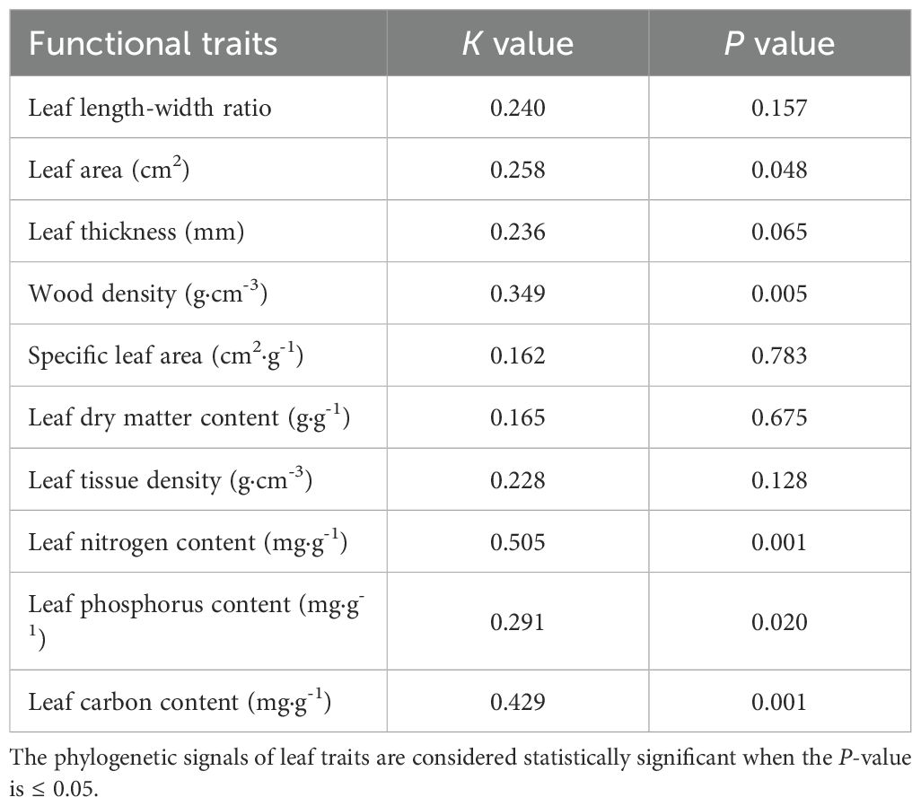 We adopt the K value from the Brownian motion evolution model proposed by Blomberg et al. (2003) as an indicator for phylogenetic signal analysis. If K > 1, it suggests that functional traits exhibit a stronger phylogenetic signal than what is predicted by the Brownian motion model of evolution. Conversely, K < 1, it implies that these traits display a weaker phylogenetic signal compared to the Brownian motion model. K = 1 aligns with the predictions of the Brownian motion evolutionary model. K approaching 0 suggests the absence of a phylogenetic signal, implying that trait evolution is independent (Liu et al., 2023). The significance of the phylogenetic signals of functional traits can be tested by comparing the actual K value of the community with the null model K value, which is obtained by randomly substituting the species at the end of the branch of the phylogenetic tree for 999 times. If the actual K value is more than the null model K value (P < 0.05), the phylogenetic signal for the functional trait of the community is considered significant. Otherwise, it is non-significant (Baraloto et al., 2012). The K values were calculated using the phylosignal (Keck et al., 2016) function of the R software picante package, as described by Kembel et al. (2010).