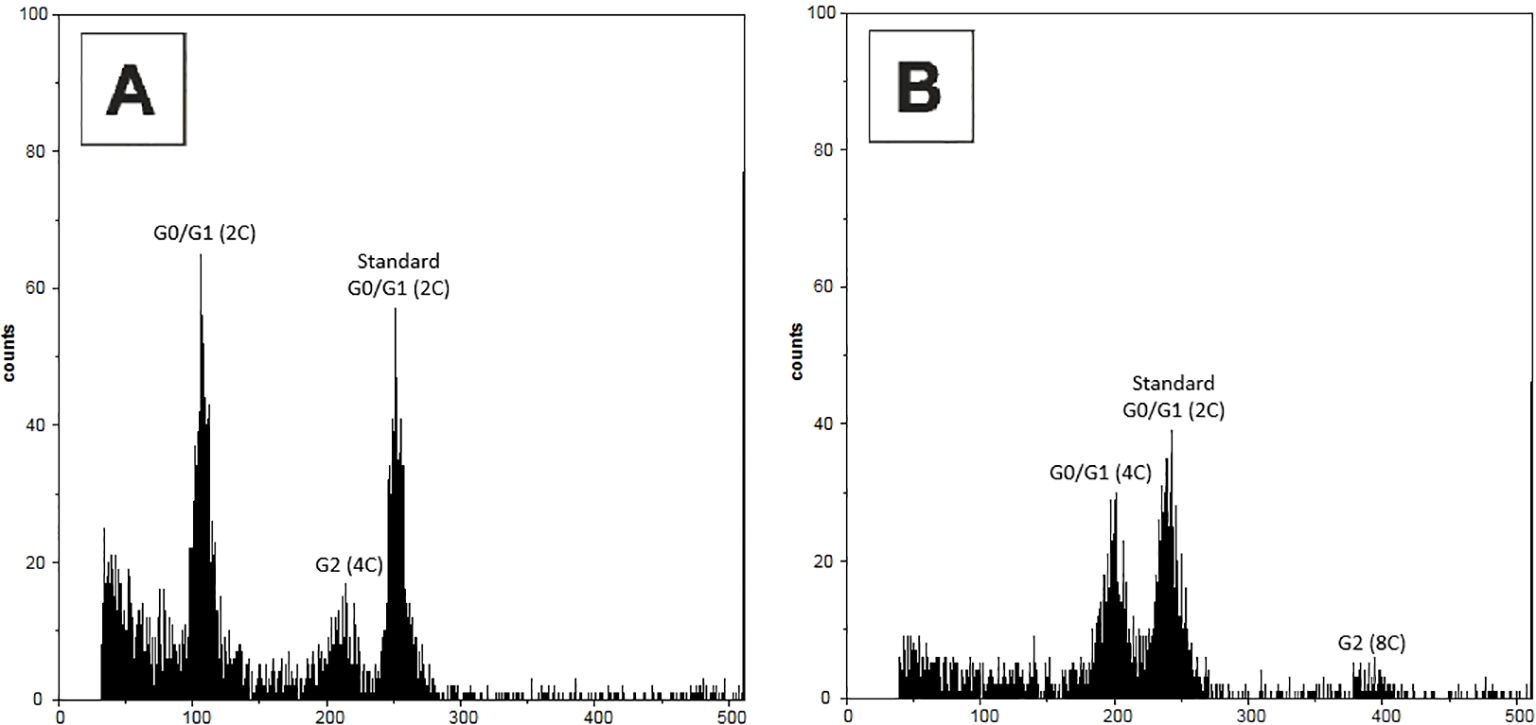 Figure 1. Representative flow cytometry histograms of leaf nuclei of Borago officinalis L. grown under in vitro conditions, stained with DAPI. (A) Diploid control plant not treated with oryzalin, showing peaks corresponding to G0/G1 (2C), G2 (4C), and the internal standard (Pisum sativum cv. Ctirad, Standard G0/G1, 2C = 8.76 pg DNA). (B) Tetraploid plant, with peaks corresponding to G0/G1 (4C), G2 (8C), and the internal standard (P. sativum, Standard G0/G1, 2C).