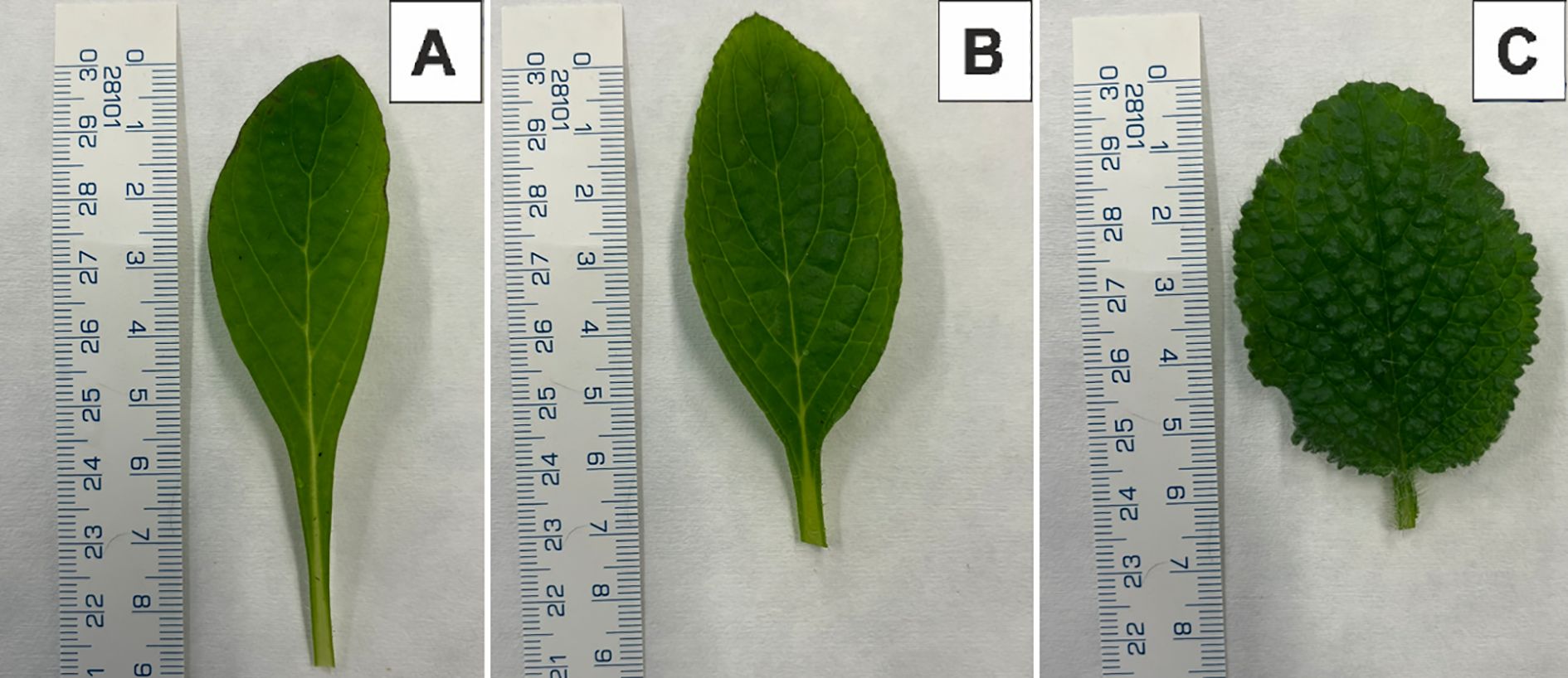 Figure 2. Young leaf morphology of Borago officinalis L. plants from ex vitro conditions. (A) Control plant 24C. (B) Tetraploid sub-clonal line 24/7. (C) Tetraploid sub-clonal line 24/13.