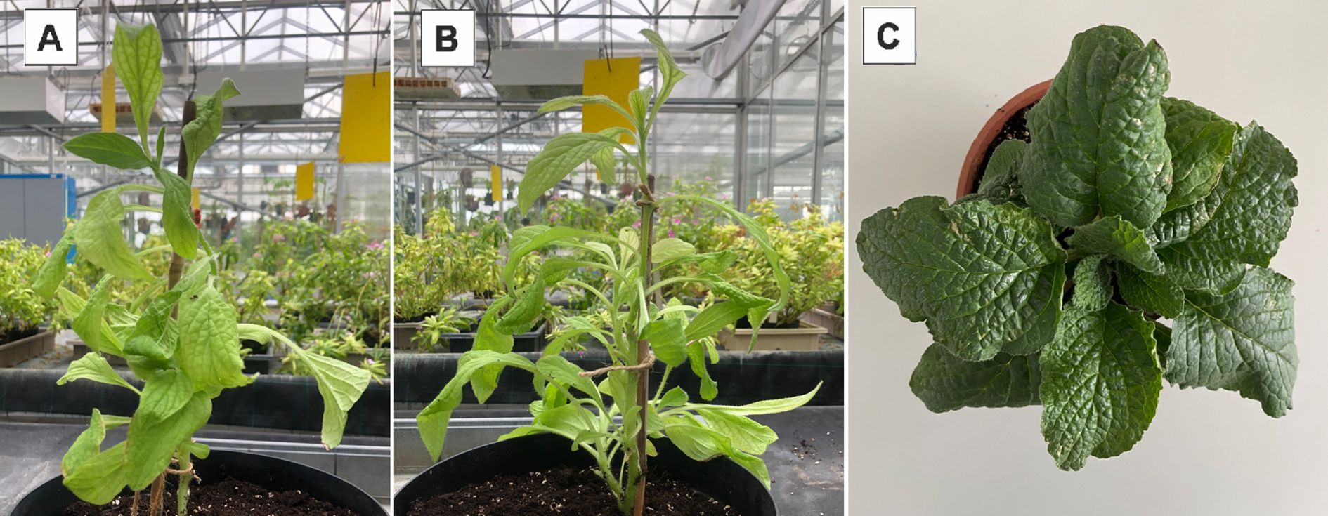 Representative ex vitro morphology is shown in Figures 2, 3. Leaf shape differed among lines: 24C and 24/7 exhibited lanceolate blades, whereas 24/13 displayed broadly ovate blades with pronounced marginal serration (Figure 2). Leaves of the tetraploid lines appeared more pubescent than those of the diploid control (Figure 2); see Section 3.5 for the trichome assessment.