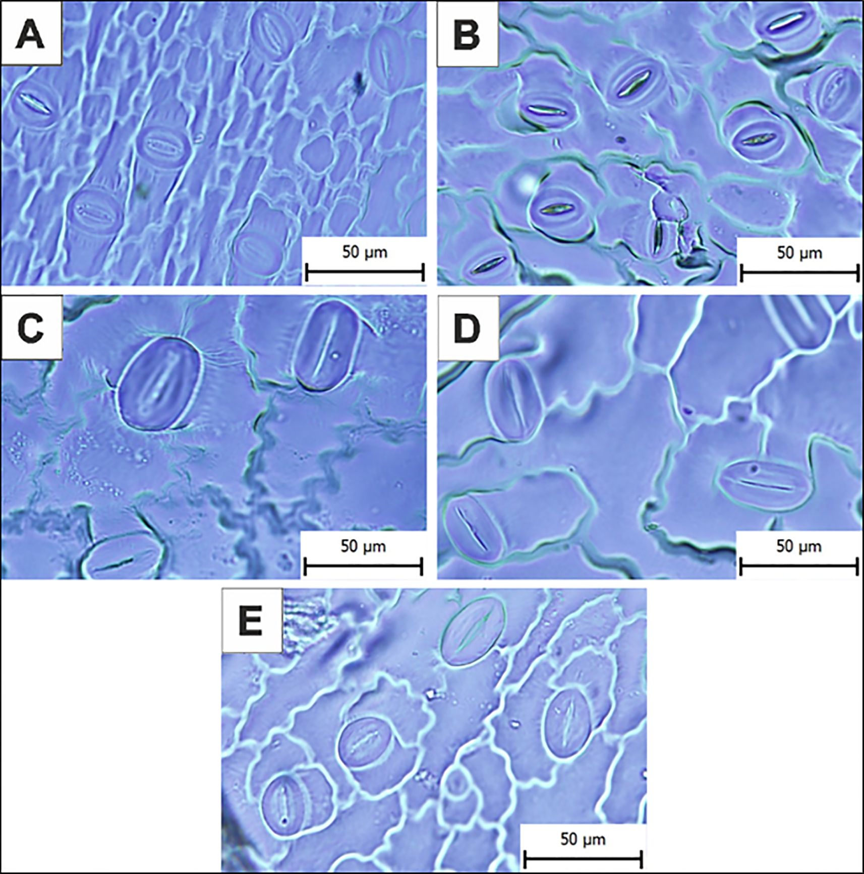 For stomatal traits, 20 microscopic fields of view per genotype were analyzed. These fields originated from multiple leaves of clonally propagated plants, ensuring representative sampling within each line. The total number of stomata measured per genotype ranged from 233 to 675.